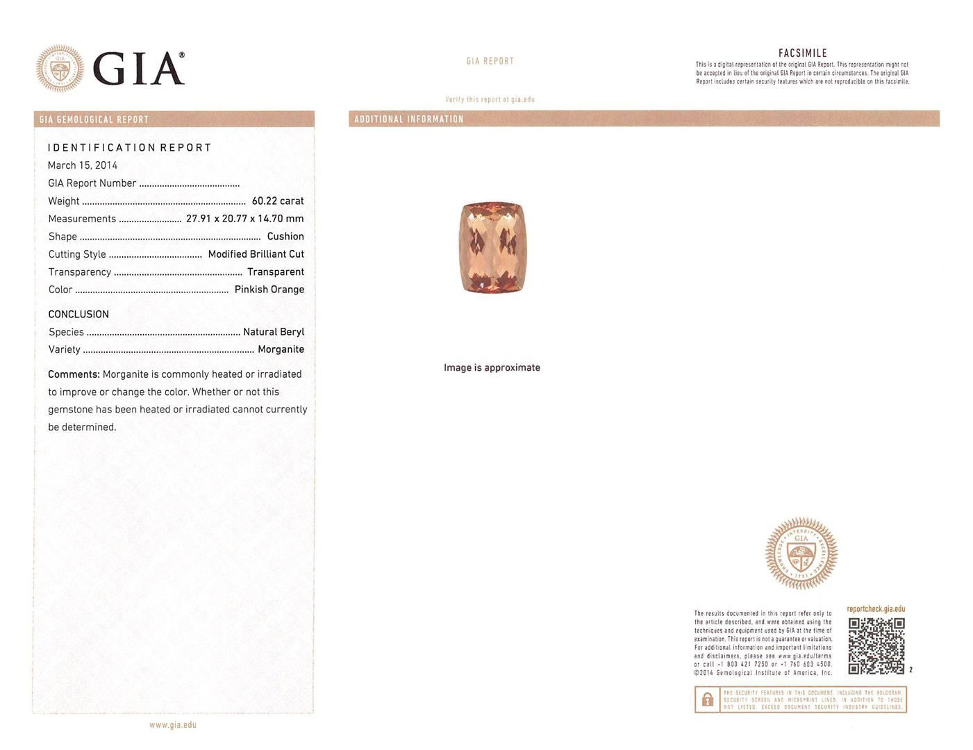 One prong set cushion modified brilliant cut natural morganite, measuring 27.91 x 20.77 x 14.70mm, exact weight 60.22ct., clarity is eye clean, type I, light, very slightly brownish, cut is good. Transmitting light with no distortion, transparent. GIA Colored Stone Grading Report attached. Graded loose prior to setting in the GIA Laboratory, Report #6157961117.Eighty-Two prong set round brilliant cut diamonds, measuring 2.20 - 2.00 x 1.26mm (depth est.) approximate total weight of 82 Stones = 2.68ct. Color & clarity grade are an average for the group. Graded in the setting. Clarity: SI-2 to I-1. Color: F - H. Total Weight of Colored Stones 60.22ct. Total Weight of Diamonds 2.68ct. Total Weight of Ring 28.37gm. AIG Appraised at $43,580.00.