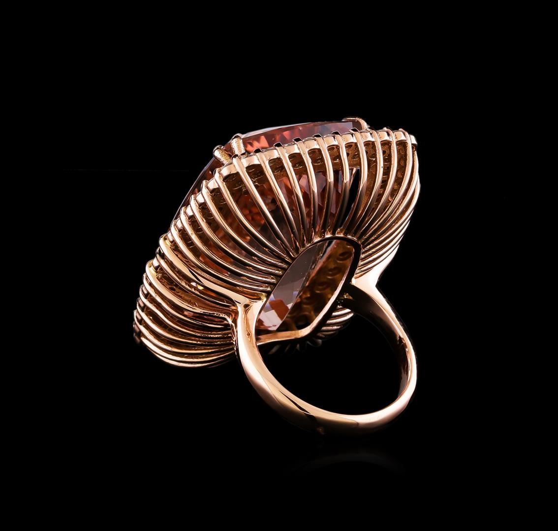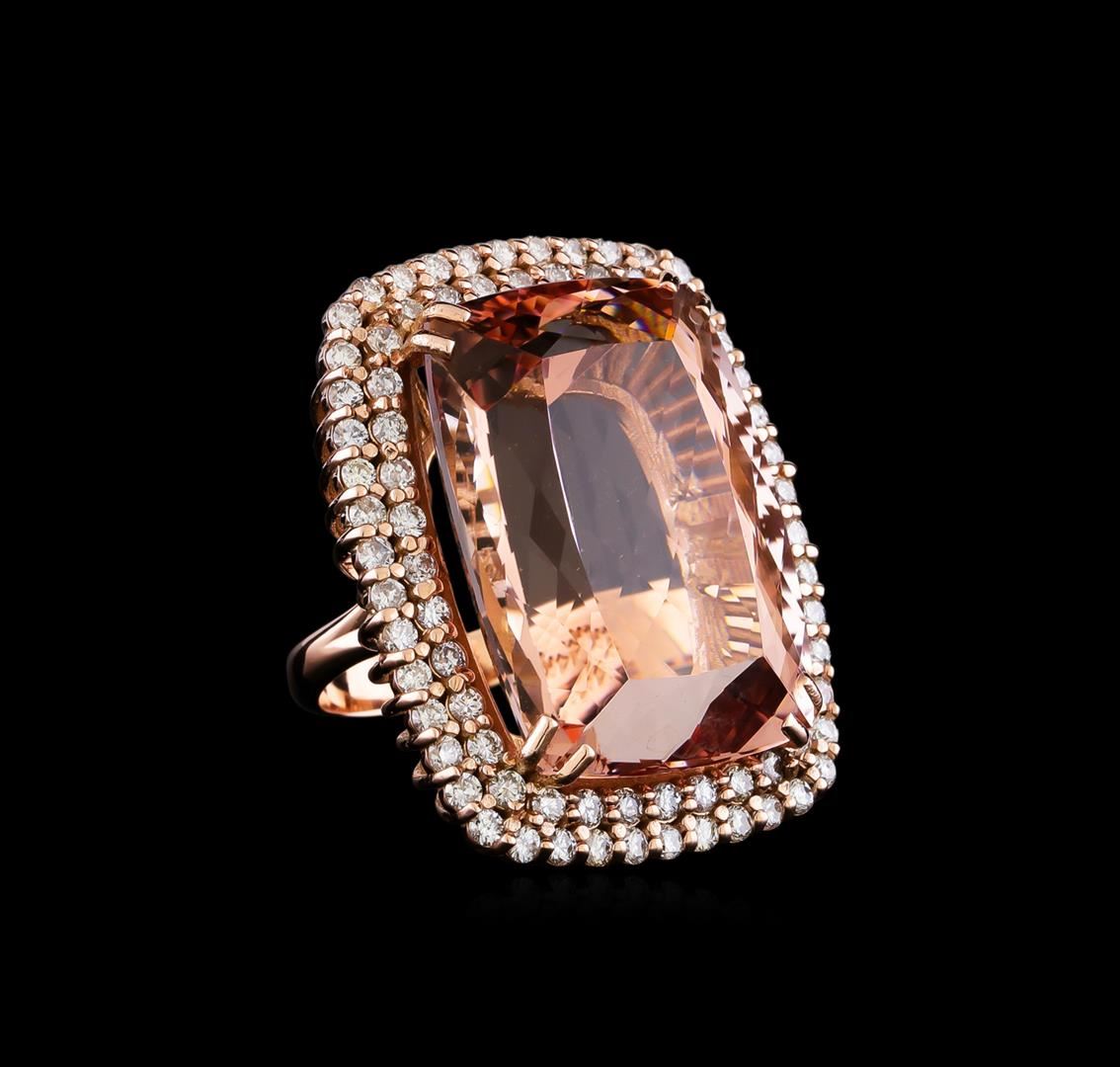 One prong set cushion modified brilliant cut natural morganite, measuring 27.91 x 20.77 x 14.70mm, exact weight 60.22ct., clarity is eye clean, type I, light, very slightly brownish, cut is good. Transmitting light with no distortion, transparent. GIA Colored Stone Grading Report attached. Graded loose prior to setting in the GIA Laboratory, Report #6157961117.Eighty-Two prong set round brilliant cut diamonds, measuring 2.20 - 2.00 x 1.26mm (depth est.) approximate total weight of 82 Stones = 2.68ct. Color & clarity grade are an average for the group. Graded in the setting. Clarity: SI-2 to I-1. Color: F - H. Total Weight of Colored Stones 60.22ct. Total Weight of Diamonds 2.68ct. Total Weight of Ring 28.37gm. AIG Appraised at $43,580.00.