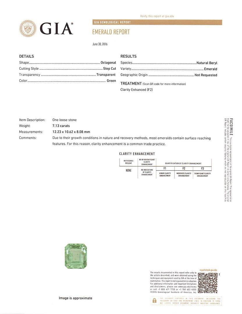 One electronically tested 14KT white gold ladies cast emerald and diamond ring with a bright polish finish. The featured emerald is set within a diamond floret supported by a ribbed under gallery, completed by a two and one-half millimeter wide band. Identified with markings of '14K'. Condition is new, good workmanship. Containing: One prong set octagonal step cut natural emerald, measuring 12.23 x 10.62 x 8.08mm, exact weight 7.13ct., clarity is slightly included, type III, medium light, very slightly grayish, green color, (GIA G 4/3), cut is good. Transmitting light with a minimum of distortion, transparent. Naturally occurring internal & external characteristics are present. Moderate clarity enhancement. GIA Gemological Report attached. Graded loose prior to setting in the GIA Laboratory, Report #1172664647. Twenty-Four prong set round brilliant cut diamonds, measuring 1.80 - 1.80 x 1.08mm (depth est.) approximate total weight of 24 Stones = 0.56ct. Graded in the setting. Clarity SI-2 to I-2. Color: G - I. Total Weight of Colored Stones 7.13ct.. Total Weight of Diamonds 0.56ct.. Total Weight of Ring 7.41gm. AIG Appraised at $12,925.00.