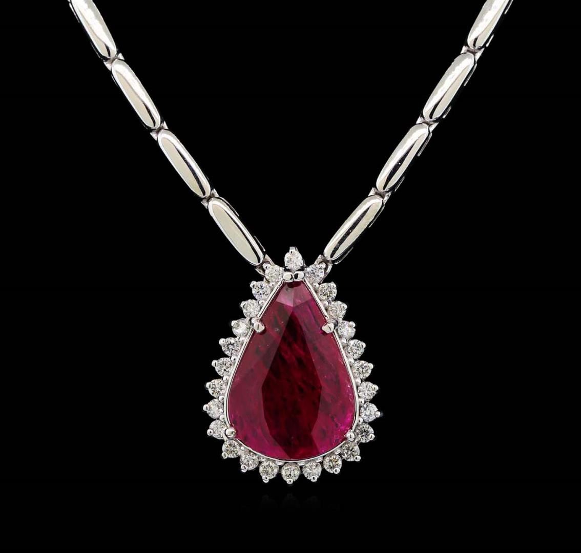 One electronically tested 18KT white gold lady's combination cast & assembled fashion necklace with a tongue clasp with foldover safety with a bright polish finish. The featured lady's necklace has a pear shaped solitaire halo motif and measures 17 inches in length. Identified with markings of '18K'. Condition is new, good workmanship. Containing: One prong set pear modified mixed cut natural ruby, measuring 20.32 x 13.98 x 2.87mm, (depth est.) 10%. bulge factor, approximate weight of 7.14ct., clarity is heavily included, medium dark, moderately strong, strongly purplish red color, (GIA stpR 6/4), cut is good. Transmitting light somewhat diffusely, semi-transparent to translucent. Indications of laboratory high temperature heat treatment. Colored gemstones are presumed to have been subjected to commonly used enhancement processes. Graded loose prior to setting in the GIA Laboratory, Report #5171606102. Twenty-Six prong set round brilliant cut diamonds, measuring 2.10 - 2.00 x 1.23mm (depth est.) approximate total weight of 26 Stones = 0.82ct. Graded in the setting. Clarity VS-2 to SI-2. Color: H - I Cut Good. Total Weight of Colored Stones 7.14ct.. Total Weight of Diamonds 0.82ct.. Total Weight of Necklace 25.00gm. GAS Appraised at $20,430.00.