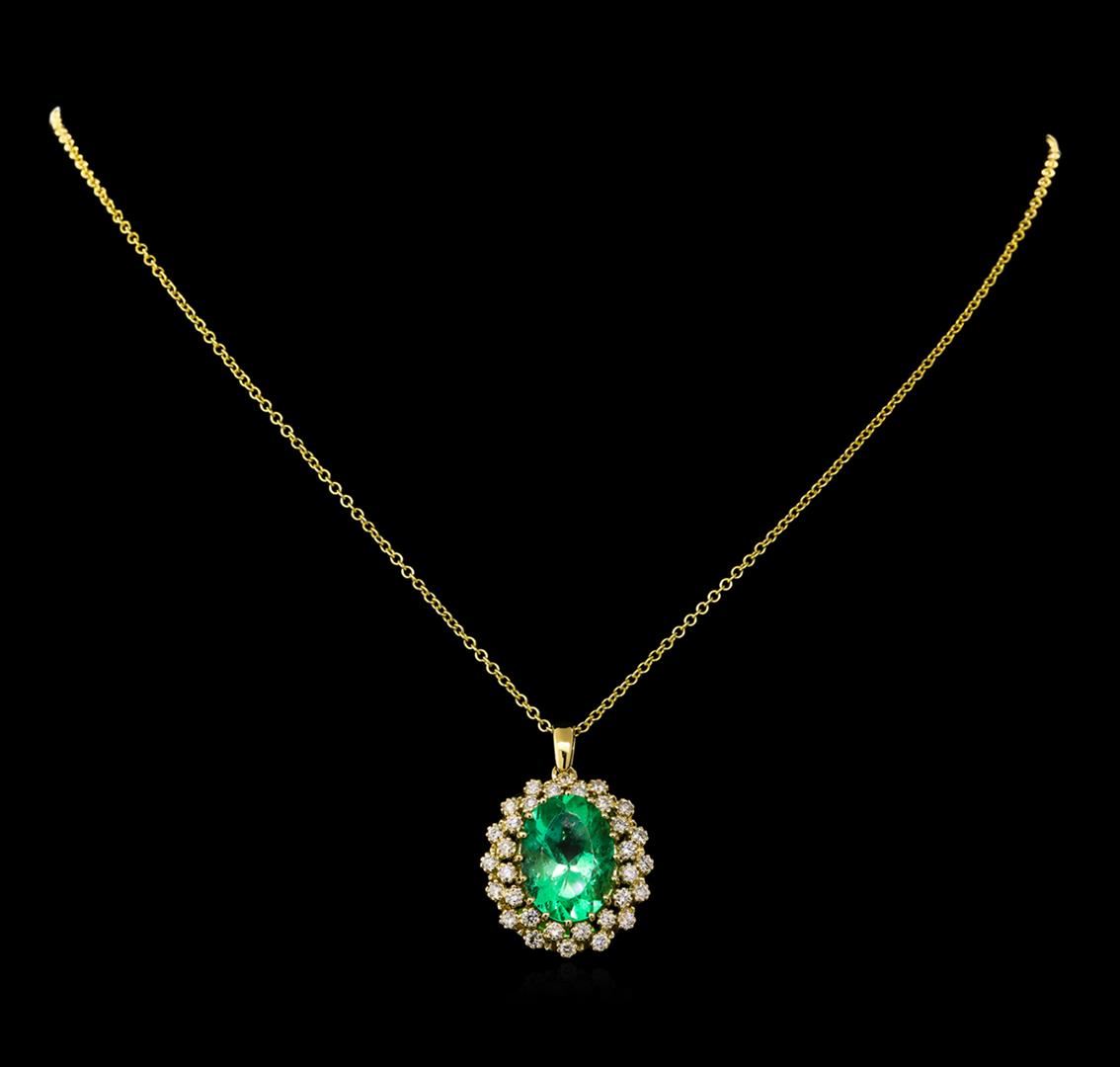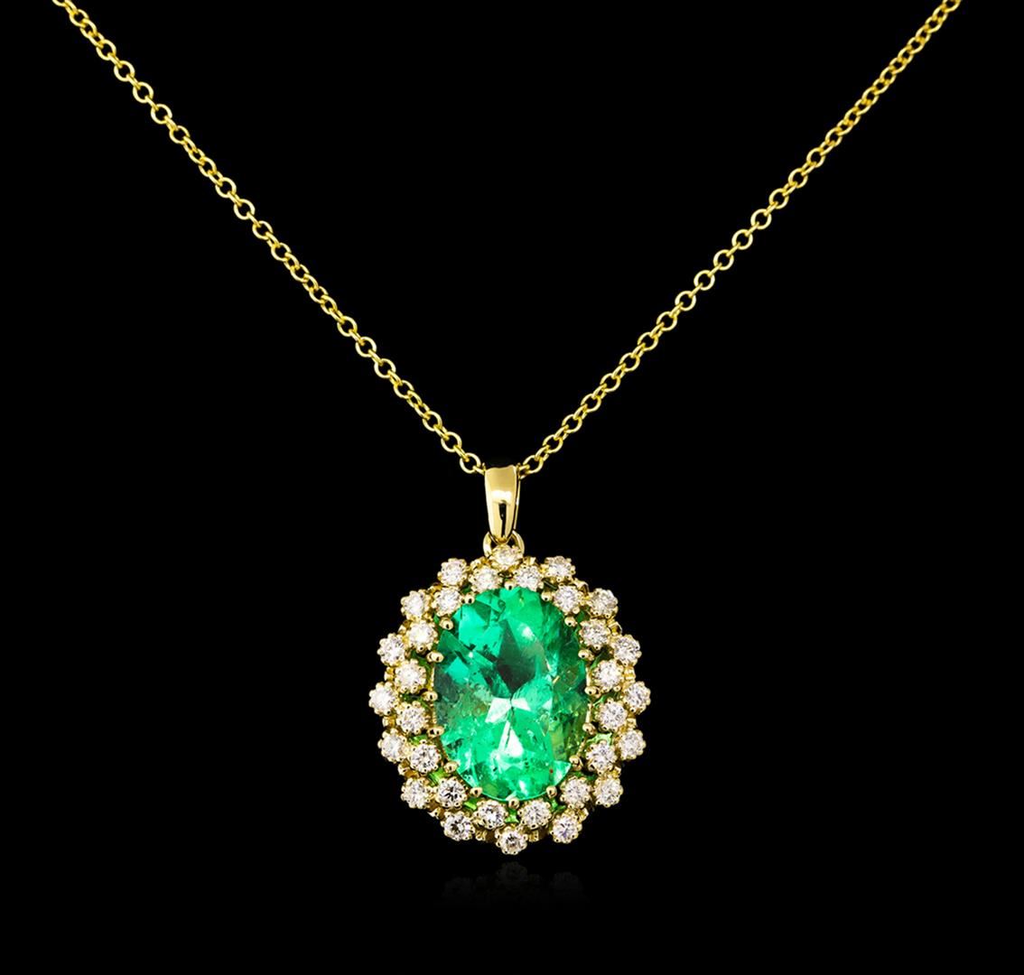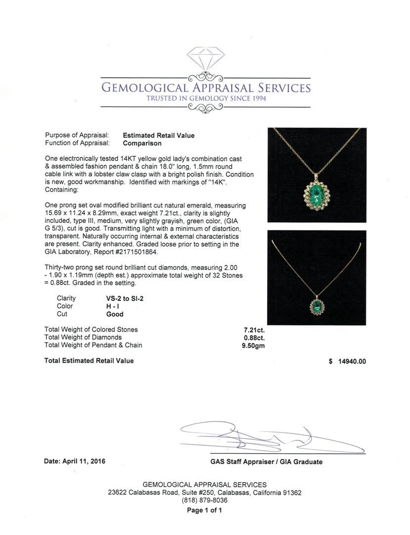 One electronically tested 14KT yellow gold lady's combination cast & assembled fashion pendant & chain 18.0" long, 1.5mm round cable link with a lobster claw clasp with a bright polish finish. Identified with markings of "14K". Condition is new, good workmanship. Containing: One prong set oval modified brilliant cut natural emerald, measuring 15.69 x 11.24 x 8.29mm, exact weight 7.21ct., clarity is slightly included, type III, medium, very slightly grayish, green color, (GIA G 5/3), cut is good. Transmitting light with a minimum of distortion, transparent. Naturally occurring internal & external characteristics are present. Clarity enhanced. Graded loose prior to setting in the GIA Laboratory, Report #2171501864.Thirty-Two prong set round brilliant cut diamonds, measuring 2.00 - 1.90 x 1.19mm (depth est.) approximate total weight of 32 Stones = 0.88ct. Graded in the setting. Clarity: VS-2 to SI-2. Color: H - I. Cut Good. Total Weight of Colored Stones 7.21ct. Total Weight of Diamonds 0.88ct. Total Weight of Pendant & Chain 9.50gm. GAS Appraised at $14,940.00.