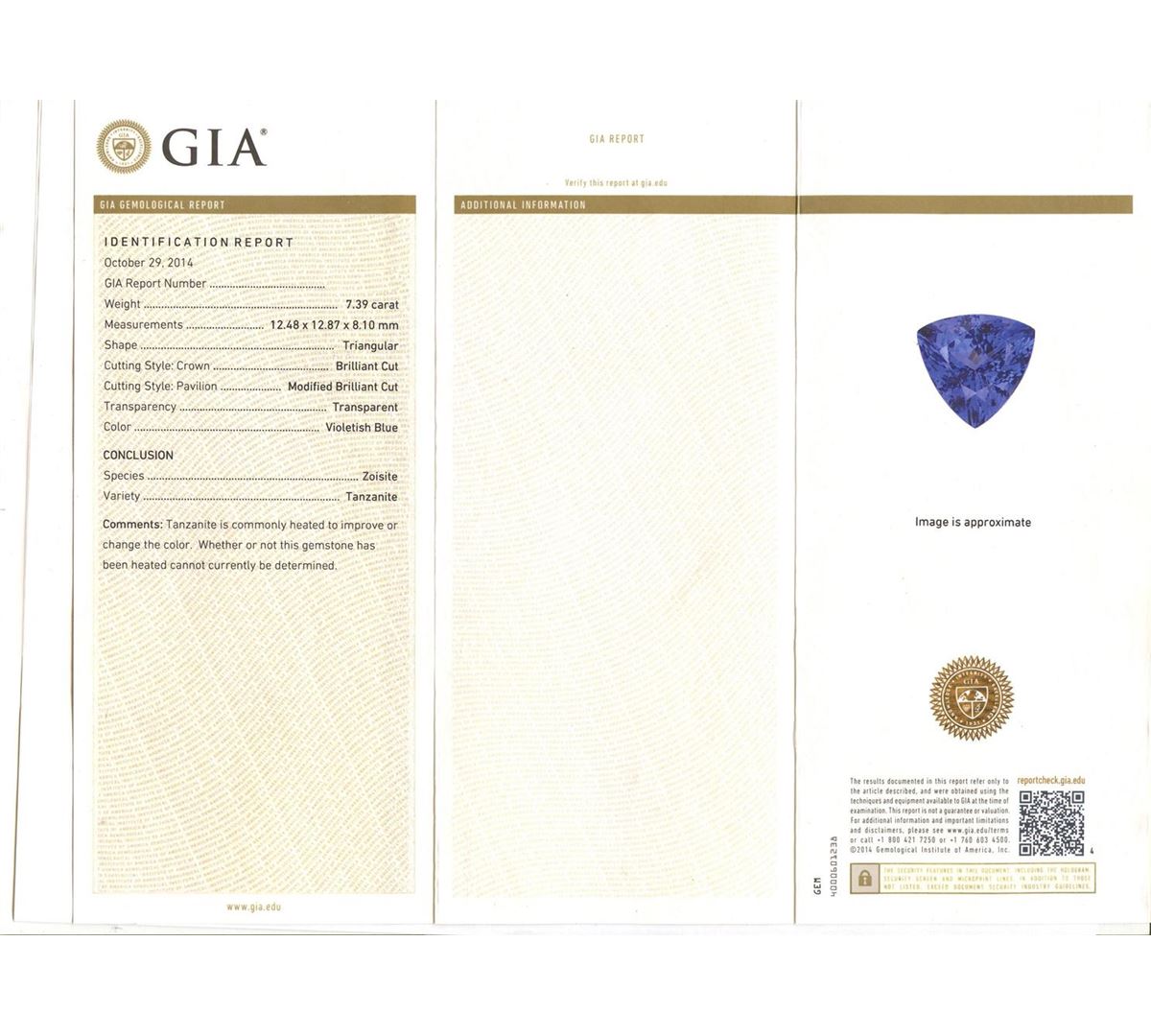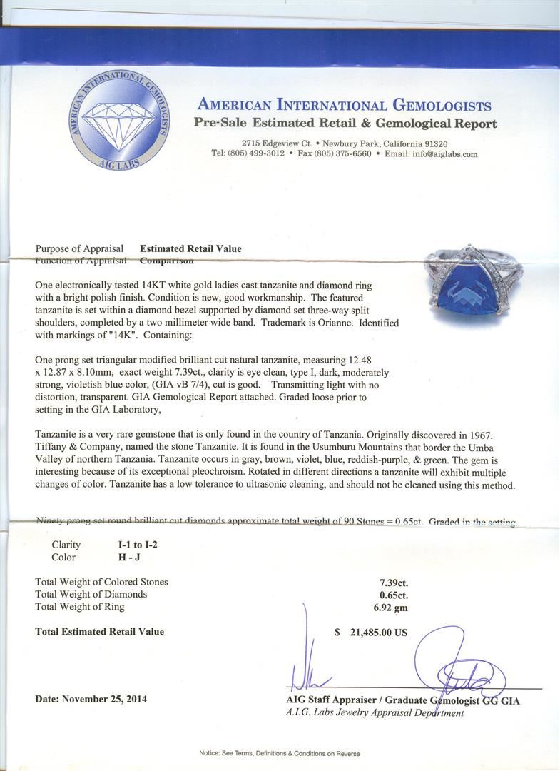 One electronically tested 14KT white gold ladies cast tanzanite and diamond ring with a bright polish finish. The featured tanzanite is set within a diamond bezel supported by diamond set three-way split shoulders, completed by a two millimeter wide band. Trademark is Orianne. Identified with markings of "14K". Condition is new, good workmanship. Containing: One prong set triangular modified brilliant cut natural tanzanite, measuring 12.48 x 12.87 x 8.10mm, exact weight 7.39ct., clarity is eye clean, type I, dark, moderately strong, violetish blue color, (GIA vB 7/4), cut is good. Transmitting light with no distortion, transparent. GIA Gemological Report attached. Graded loose prior to setting in the GIA Laboratory, Report #2161724381.Tanzanite is a very rare gemstone that is only found in the country of Tanzania. Originally discovered in 1967. Tiffany & Company, named the stone Tanzanite. It is found in the Usumburu Mountains that border the Umba Valley of northern Tanzania. Tanzanite occurs in gray, brown, violet, blue, reddish-purple, & green. The gem is interesting because of its exceptional pleochroism. Rotated in different directions a tanzanite will exhibit multiple changes of color. Tanzanite has a low tolerance to ultrasonic cleaning, and should not be cleaned using this method. Ninety prong set round brilliant cut diamonds approximate total weight of 90 Stones = 0.65ct. Graded in the setting. Clarity: I-1 to I-2. Color: H - J. Total Weight of Colored Stones 7.39ct. Total Weight of Diamonds 0.65c AIG Appraised at $21,485.00.