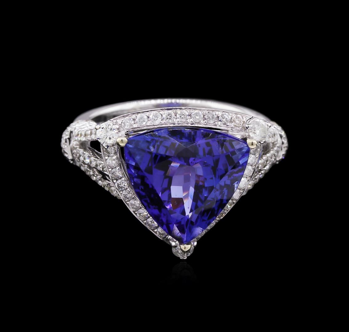 One electronically tested 14KT white gold ladies cast tanzanite and diamond ring with a bright polish finish. The featured tanzanite is set within a diamond bezel supported by diamond set three-way split shoulders, completed by a two millimeter wide band. Trademark is Orianne. Identified with markings of "14K". Condition is new, good workmanship. Containing: One prong set triangular modified brilliant cut natural tanzanite, measuring 12.48 x 12.87 x 8.10mm, exact weight 7.39ct., clarity is eye clean, type I, dark, moderately strong, violetish blue color, (GIA vB 7/4), cut is good. Transmitting light with no distortion, transparent. GIA Gemological Report attached. Graded loose prior to setting in the GIA Laboratory, Report #2161724381.Tanzanite is a very rare gemstone that is only found in the country of Tanzania. Originally discovered in 1967. Tiffany & Company, named the stone Tanzanite. It is found in the Usumburu Mountains that border the Umba Valley of northern Tanzania. Tanzanite occurs in gray, brown, violet, blue, reddish-purple, & green. The gem is interesting because of its exceptional pleochroism. Rotated in different directions a tanzanite will exhibit multiple changes of color. Tanzanite has a low tolerance to ultrasonic cleaning, and should not be cleaned using this method. Ninety prong set round brilliant cut diamonds approximate total weight of 90 Stones = 0.65ct. Graded in the setting. Clarity: I-1 to I-2. Color: H - J. Total Weight of Colored Stones 7.39ct. Total Weight of Diamonds 0.65c AIG Appraised at $21,485.00.