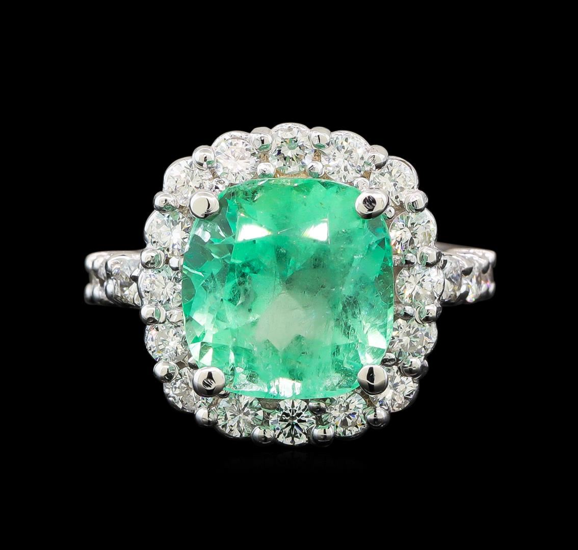 One electronically tested 14KT white gold ladies cast emerald and diamond ring with a bright polish finish. The featured emerald is set within a diamond bezel supported by a ribbed under gallery and diamond set shoulders, completed by a two millimeter wide band. Identified with markings of '14K'. Condition is new, good workmanship. Containing: One prong set cushion modified brilliant cut natural emerald, measuring 11.85 x 11.34 x 9.02mm, exact weight 7.46ct., clarity is moderately included, type III, medium light, very slightly grayish, green color, (GIA G 4/3), cut is good. Transmitting light with a minimum of distortion, transparent. Naturally occurring internal & external characteristics are present. Moderate clarity enhancement. GIA Gemological Report attached. Graded loose prior to setting in the GIA Laboratory, Report #5172665501. Twenty-Two prong set round brilliant cut diamonds, measuring 2.60 - 2.50 x 1.53mm (depth est.) approximate total weight of 22 Stones = 1.35ct. Graded in the setting. Clarity SI-2 to I-2. Color: G - I. Total Weight of Colored Stones 7.46ct.. Total Weight of Diamonds 1.35ct.. Total Weight of Ring 9.47gm. AIG Appraised at $15,585.00.