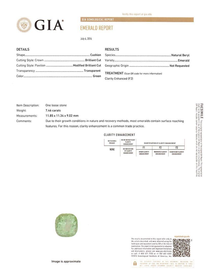 One electronically tested 14KT white gold ladies cast emerald and diamond ring with a bright polish finish. The featured emerald is set within a diamond bezel supported by a ribbed under gallery and diamond set shoulders, completed by a two millimeter wide band. Identified with markings of '14K'. Condition is new, good workmanship. Containing: One prong set cushion modified brilliant cut natural emerald, measuring 11.85 x 11.34 x 9.02mm, exact weight 7.46ct., clarity is moderately included, type III, medium light, very slightly grayish, green color, (GIA G 4/3), cut is good. Transmitting light with a minimum of distortion, transparent. Naturally occurring internal & external characteristics are present. Moderate clarity enhancement. GIA Gemological Report attached. Graded loose prior to setting in the GIA Laboratory, Report #5172665501. Twenty-Two prong set round brilliant cut diamonds, measuring 2.60 - 2.50 x 1.53mm (depth est.) approximate total weight of 22 Stones = 1.35ct. Graded in the setting. Clarity SI-2 to I-2. Color: G - I. Total Weight of Colored Stones 7.46ct.. Total Weight of Diamonds 1.35ct.. Total Weight of Ring 9.47gm. AIG Appraised at $15,585.00.