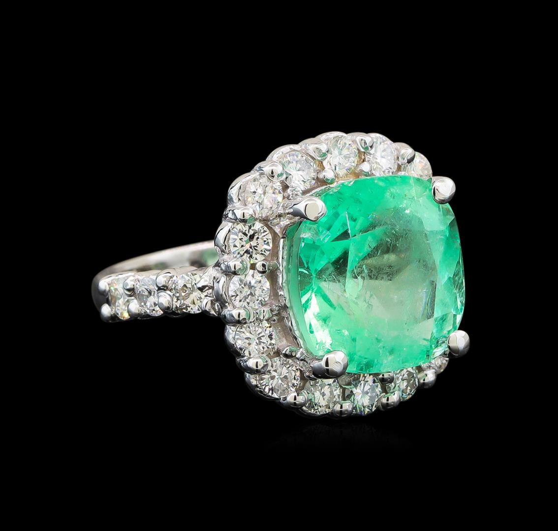 One electronically tested 14KT white gold ladies cast emerald and diamond ring with a bright polish finish. The featured emerald is set within a diamond bezel supported by a ribbed under gallery and diamond set shoulders, completed by a two millimeter wide band. Identified with markings of '14K'. Condition is new, good workmanship. Containing: One prong set cushion modified brilliant cut natural emerald, measuring 11.85 x 11.34 x 9.02mm, exact weight 7.46ct., clarity is moderately included, type III, medium light, very slightly grayish, green color, (GIA G 4/3), cut is good. Transmitting light with a minimum of distortion, transparent. Naturally occurring internal & external characteristics are present. Moderate clarity enhancement. GIA Gemological Report attached. Graded loose prior to setting in the GIA Laboratory, Report #5172665501. Twenty-Two prong set round brilliant cut diamonds, measuring 2.60 - 2.50 x 1.53mm (depth est.) approximate total weight of 22 Stones = 1.35ct. Graded in the setting. Clarity SI-2 to I-2. Color: G - I. Total Weight of Colored Stones 7.46ct.. Total Weight of Diamonds 1.35ct.. Total Weight of Ring 9.47gm. AIG Appraised at $15,585.00.