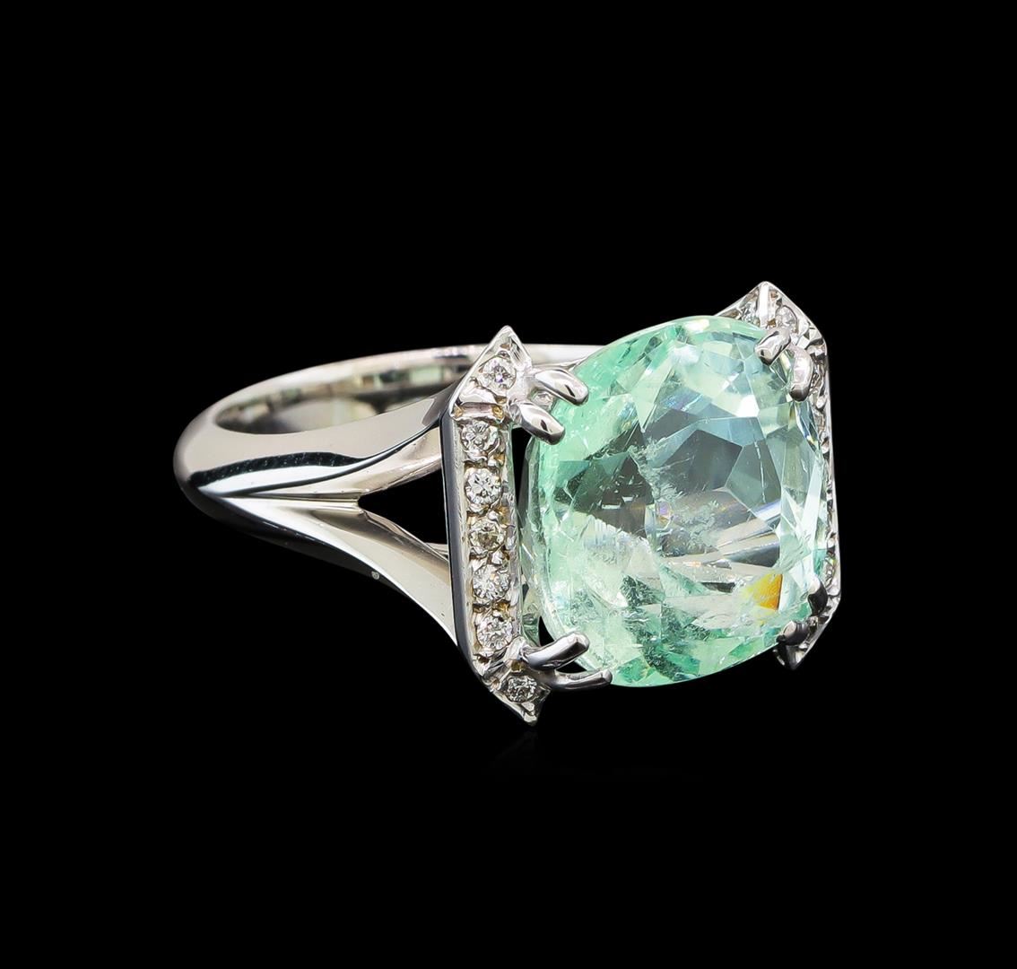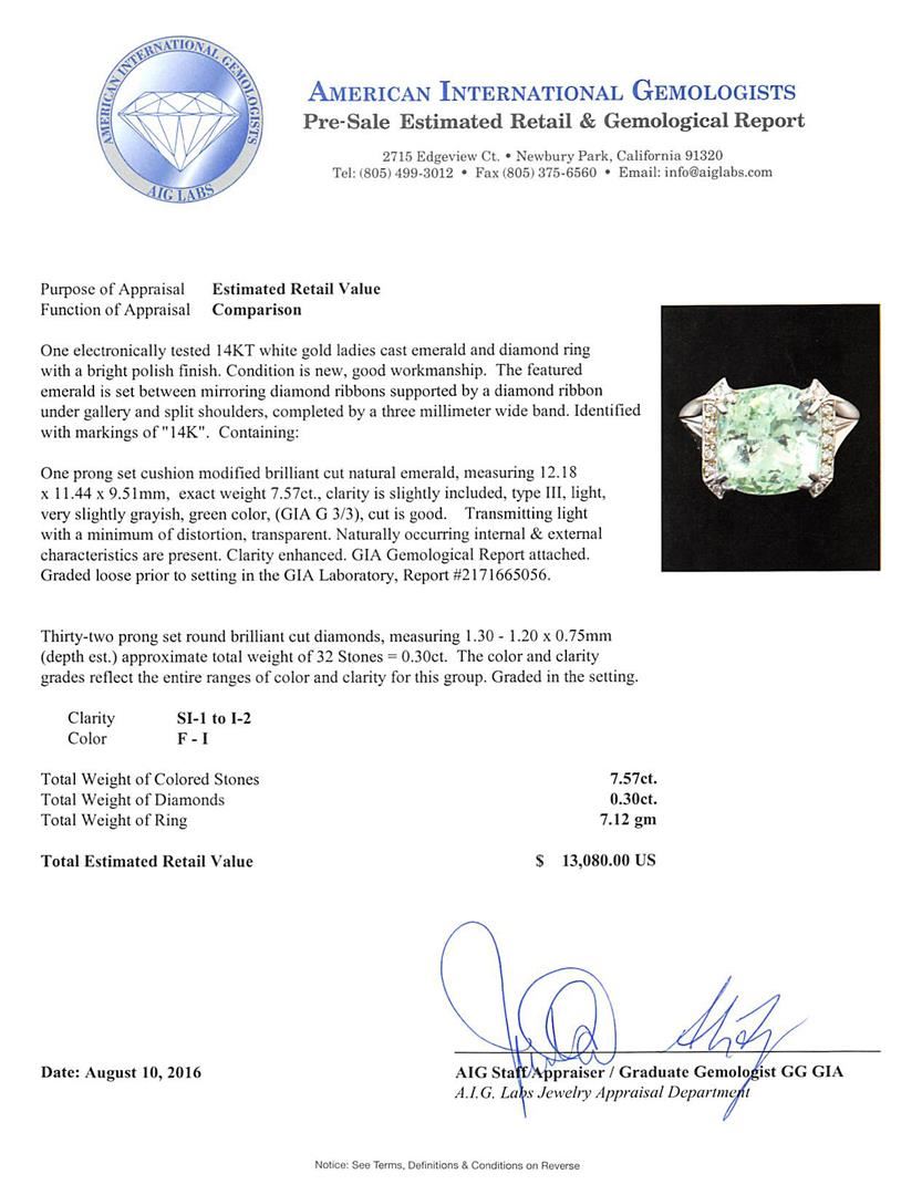 One electronically tested 14KT white gold ladies cast emerald and diamond ring with a bright polish finish. The featured emerald is set between mirroring diamond ribbons supported by a diamond ribbon under gallery and split shoulders, completed by a three millimeter wide band. Identified with markings of '14K'. Condition is new, good workmanship. Containing: One prong set cushion modified brilliant cut natural emerald, measuring 12.18 x 11.44 x 9.51mm, exact weight 7.57ct., clarity is slightly included, type III, light, very slightly grayish, green color, (GIA G 3/3), cut is good. Transmitting light with a minimum of distortion, transparent. Naturally occurring internal & external characteristics are present. Clarity enhanced. GIA Gemological Report attached. Graded loose prior to setting in the GIA Laboratory, Report #2171665056. Thirty-Two prong set round brilliant cut diamonds, measuring 1.30 - 1.20 x 0.75mm (depth est.) approximate total weight of 32 Stones = 0.30ct. The color and clarity grades reflect the entire ranges of color and clarity for this group. Graded in the setting. Clarity SI-1 to I-2. Color: F - I. Total Weight of Colored Stones 7.57ct.. Total Weight of Diamonds 0.30ct.. Total Weight of Ring 7.12gm. AIG Appraised at $13,080.00.