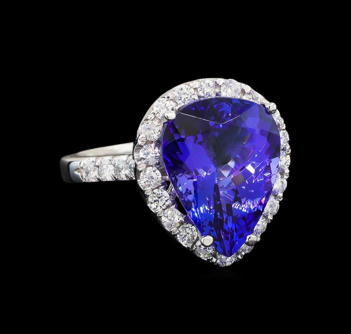 One electronically tested 14KT white gold lady's cast fashion ring with a cathedral shank with a basket halo with a bright polish finish. The featured lady's ring has a shank measuring 2.30 millimeters wide. Identified with markings of '14K'. Condition is new, good workmanship. Containing: One prong set pear modified brilliant cut natural tanzanite, measuring 14.53 x 11.25 x 7.35mm, (depth est.) approximate weight of 7.70 ct., clarity is eye clean, medium dark, moderately strong, bluish violet color, (GIA bV 6/4), cut is very good. Transmitting light with no distortion, transparent. Colored gemstones are presumed to have been subjected to commonly used enhancement processes. Graded loose prior to setting in the GIA Laboratory, Report #2171668377. Twenty-Eight prong set round brilliant cut diamonds, measuring 2.00 - 1.90 x 1.17mm (depth est.) approximate total weight of 28 Stones = 0.76ct. Graded in the setting. Clarity SI-1 to I-1. Color: G - I Cut Good. Total Weight of Colored Stones 7.70 ct.. Total Weight of Diamonds 0.76ct.. Total Weight of Ring 6.40gm. GAS Appraised.