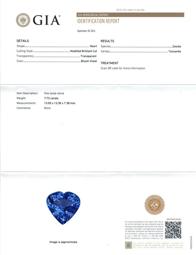 One electronically tested 14KT white gold lady's cast fashion heart shape ring with a cathedral shank with a basket halo with a bright polish finish. The featured lady's ring has a shank measuring 2.55 millimeters wide. Identified with markings of 'K14'. Condition is new, good workmanship. Containing: One prong set heart modified brilliant cut natural tanzanite, measuring 13.05 x 13.30 x 7.38mm, (depth est.) approximate weight of 7.72ct., clarity is eye clean, medium, moderately strong, bluish violet color, (GIA bV 5/4), cut is very good. Transmitting light with no distortion, transparent. Colored gemstones are presumed to have been subjected to commonly used enhancement processes. Graded loose prior to setting in the GIA Laboratory, Report #6177847958. Seventy-Eight prong set round brilliant cut diamonds, measuring 1.40 - 1.25 x 0.81mm (depth est.) approximate total weight of 78 Stones = 0.69ct. Graded in the setting. Clarity SI-1 to I-1. Color: G - I Cut Good. Total Weight of Colored Stones 7.72ct.. Total Weight of Diamonds 0.69ct.. Total Weight of Ring 9.20gm. GAS Appraised at $13,120.00.