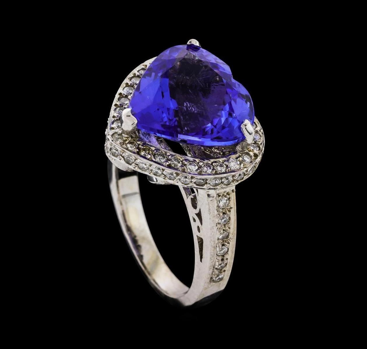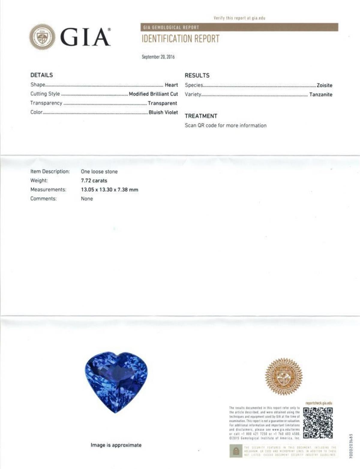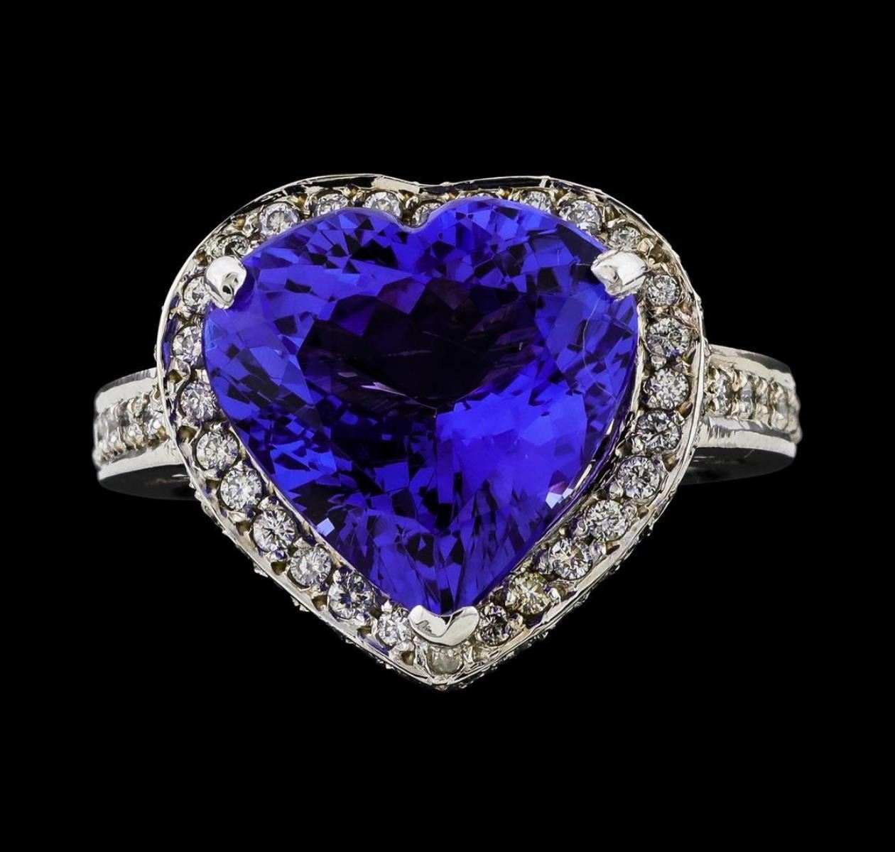 One electronically tested 14KT white gold lady's cast fashion heart shape ring with a cathedral shank with a basket halo with a bright polish finish. The featured lady's ring has a shank measuring 2.55 millimeters wide. Identified with markings of 'K14'. Condition is new, good workmanship. Containing: One prong set heart modified brilliant cut natural tanzanite, measuring 13.05 x 13.30 x 7.38mm, (depth est.) approximate weight of 7.72ct., clarity is eye clean, medium, moderately strong, bluish violet color, (GIA bV 5/4), cut is very good. Transmitting light with no distortion, transparent. Colored gemstones are presumed to have been subjected to commonly used enhancement processes. Graded loose prior to setting in the GIA Laboratory, Report #6177847958. Seventy-Eight prong set round brilliant cut diamonds, measuring 1.40 - 1.25 x 0.81mm (depth est.) approximate total weight of 78 Stones = 0.69ct. Graded in the setting. Clarity SI-1 to I-1. Color: G - I Cut Good. Total Weight of Colored Stones 7.72ct.. Total Weight of Diamonds 0.69ct.. Total Weight of Ring 9.20gm. GAS Appraised.