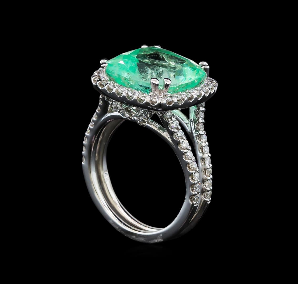 One electronically tested 14KT white gold lady's cast fashion ring with a split shank basket halo with a bright polish finish. The featured lady's ring has a shank measuring 3.70 millimeters wide. Identified with markings of '14K'. Condition is new, good workmanship. Containing: One prong set square cushion modified brilliant cut natural emerald, measuring 12.50 x 12.35 x 8.80mm, (depth est.) approximate weight of 7.73ct., clarity is slightly included, medium light, moderately strong, green color, (GIA G 4/4), cut is good. Transmitting light with a minimum of distortion, transparent. Clarity enhanced. Colored gemstones are presumed to have been subjected to commonly used enhancement processes. Graded loose prior to setting in the GIA Laboratory, Report #5171664641. Ninety-Six prong set round brilliant cut diamonds, measuring 1.50 - 1.40 x 0.87mm (depth est.) approximate total weight of 96 Stones = 1.08ct. Graded in the setting. Clarity SI-1 to I-1. Color: G - I Cut Good. Total Weight of Colored Stones 7.73ct.. Total Weight of Diamonds 1.08ct.. Total Weight of Ring 7.80gm. GAS Appraised at $15,065.00.