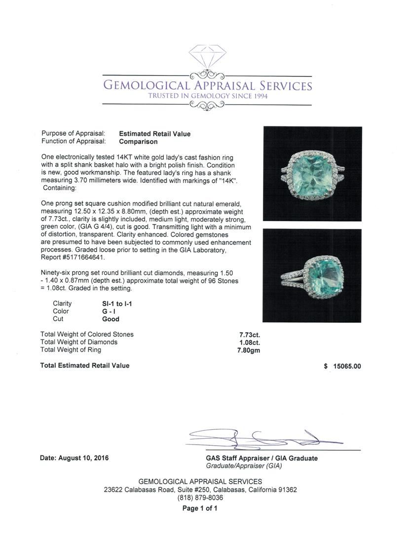 One electronically tested 14KT white gold lady's cast fashion ring with a split shank basket halo with a bright polish finish. The featured lady's ring has a shank measuring 3.70 millimeters wide. Identified with markings of '14K'. Condition is new, good workmanship. Containing: One prong set square cushion modified brilliant cut natural emerald, measuring 12.50 x 12.35 x 8.80mm, (depth est.) approximate weight of 7.73ct., clarity is slightly included, medium light, moderately strong, green color, (GIA G 4/4), cut is good. Transmitting light with a minimum of distortion, transparent. Clarity enhanced. Colored gemstones are presumed to have been subjected to commonly used enhancement processes. Graded loose prior to setting in the GIA Laboratory, Report #5171664641. Ninety-Six prong set round brilliant cut diamonds, measuring 1.50 - 1.40 x 0.87mm (depth est.) approximate total weight of 96 Stones = 1.08ct. Graded in the setting. Clarity SI-1 to I-1. Color: G - I Cut Good. Total Weight of Colored Stones 7.73ct.. Total Weight of Diamonds 1.08ct.. Total Weight of Ring 7.80gm. GAS Appraised at $15,065.00.