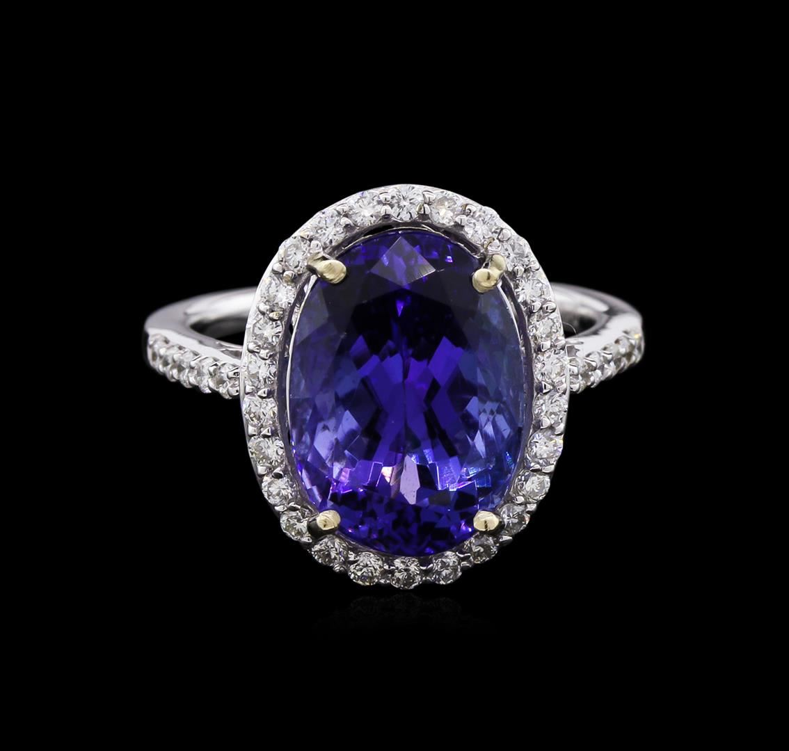 One electronically tested 18KT white gold ladies cast tanzanite and diamond ring with a bright polish finish. The featured tanzanite is set within a diamond bezel supported by diamond set shoulders, completed by a one and one-half millimeter wide band. Trademark is Orianne. Identified with markings of "18K". Condition is new, good workmanship. Containing: One prong set oval modified brilliant cut natural tanzanite, measuring 13.49 x 9.65 x 7.87mm, exact weight 7.76ct., type I Clarity is eye clean, dark, moderately strong, blue-violet color, (GIA BV), cut is good. Transmitting light with no distortion, transparent. GIA Gemological Report attached. Graded loose prior to setting in the GIA Laboratory, Report #1166724862.Tanzanite is a very rare gemstone that is only found in the country of Tanzania. Originally discovered in 1967. Tiffany & Company, named the stone Tanzanite. It is found in the Usumburu Mountains that border the Umba Valley of northern Tanzania. Tanzanite occurs in gray, brown, violet, blue, reddish-purple, & green. The gem is interesting because of its exceptional pleochroism. Rotated in different directions a tanzanite will exhibit multiple changes of color. Tanzanite has a low tolerance to ultrasonic cleaning, and should not be cleaned using this method. Thirty-Six prong set round brilliant cut diamonds, measuring 1.60 - 1.50 x 0.93mm (depth est.) approximate total weight of 36 Stones = 0.56ct. Graded in the setting. Clarity: SI-1 to I-1. Color: G - I. Total Weight of Colored Stones 7.76ct. Total Weight of Diamonds 0.56ct. AIG Appraised at $22,290.00.