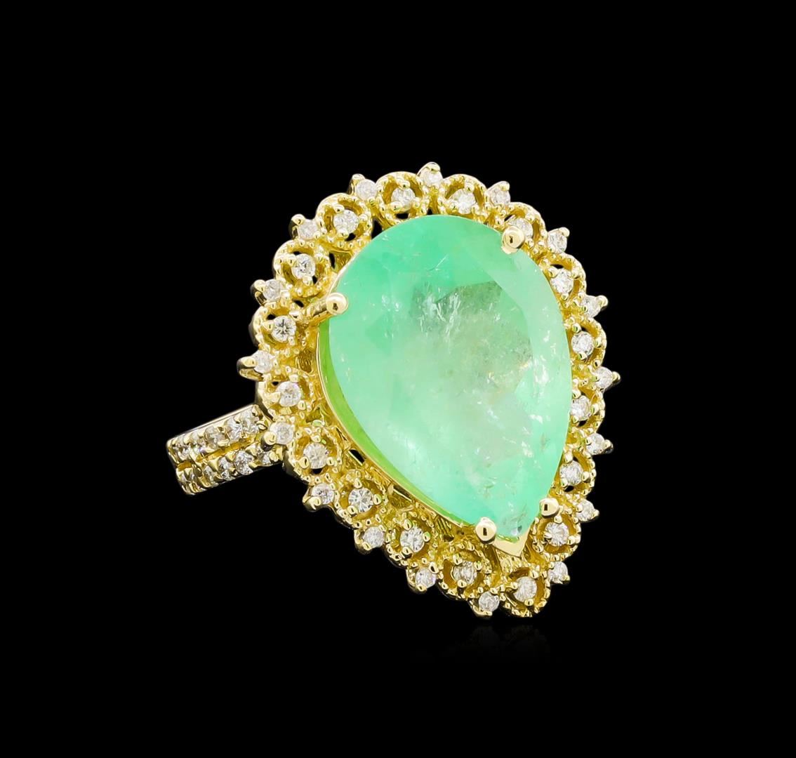 One electronically tested 14KT yellow gold lady's cast fashion ring with a basket halo with a bright polish with milgrain detailing finish. The featured lady's ring has a shank measuring 2.82 millimeters wide. Identified with markings of "K14". Condition is new, good workmanship. Containing: One prong set pear modified brilliant cut natural emerald, measuring 16.24 x 11.78 x 7.98mm, exact weight 7.89ct., clarity is heavily included, type III, medium light, very slightly grayish, green color, (GIA G 4/3), cut is good. Transmitting light somewhat diffusely, semi-transparent to translucent. Naturally occurring internal & external characteristics are present. Clarity enhanced. Graded loose prior to setting in the GIA Laboratory, Report #2175501596.Forty-One prong set round brilliant cut diamonds, measuring 1.30 - 1.25 x 0.79mm (depth est.) approximate total weight of 41 Stones = 0.33ct. Graded in the setting. Clarity: SI-1 to SI-2. Color: H - I. Cut Good Seventeen prong set round brilliant cut diamonds, measuring 1.10 - 1.00 x 0.65mm (depth est.) approximate total weight of 17 Stones = 0.08ct. Graded in the setting. Clarity: SI-1 to SI-2. Color: H - I. Cut Good. Total Weight of Colored Stones 7.89ct. Total Weight of Diamonds 0.41ct. Total Weight of Ring 7.40gm. GAS Appraised at $7,945.00.