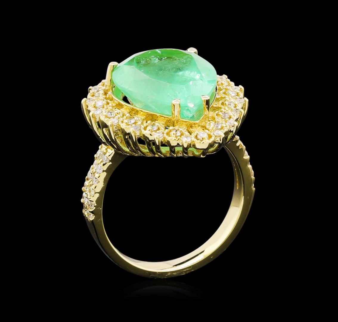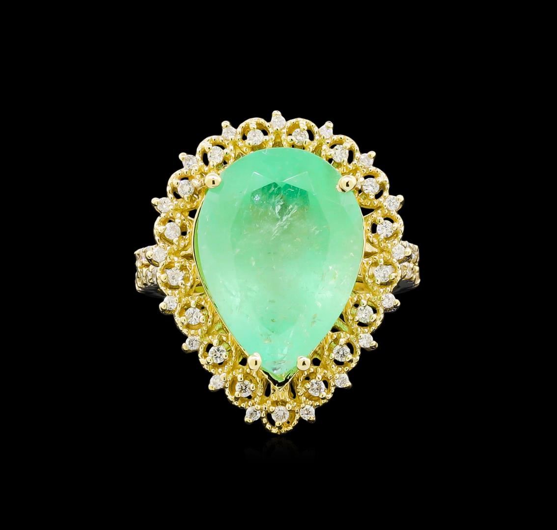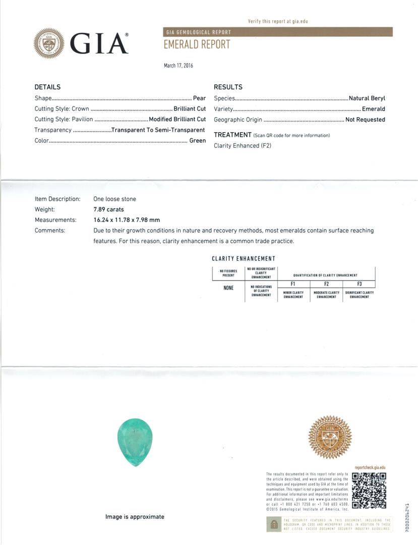 One electronically tested 14KT yellow gold lady's cast fashion ring with a basket halo with a bright polish with milgrain detailing finish. The featured lady's ring has a shank measuring 2.82 millimeters wide. Identified with markings of "K14". Condition is new, good workmanship. Containing: One prong set pear modified brilliant cut natural emerald, measuring 16.24 x 11.78 x 7.98mm, exact weight 7.89ct., clarity is heavily included, type III, medium light, very slightly grayish, green color, (GIA G 4/3), cut is good. Transmitting light somewhat diffusely, semi-transparent to translucent. Naturally occurring internal & external characteristics are present. Clarity enhanced. Graded loose prior to setting in the GIA Laboratory, Report #2175501596.Forty-One prong set round brilliant cut diamonds, measuring 1.30 - 1.25 x 0.79mm (depth est.) approximate total weight of 41 Stones = 0.33ct. Graded in the setting. Clarity: SI-1 to SI-2. Color: H - I. Cut Good Seventeen prong set round brilliant cut diamonds, measuring 1.10 - 1.00 x 0.65mm (depth est.) approximate total weight of 17 Stones = 0.08ct. Graded in the setting. Clarity: SI-1 to SI-2. Color: H - I. Cut Good. Total Weight of Colored Stones 7.89ct. Total Weight of Diamonds 0.41ct. Total Weight of Ring 7.40gm. GAS Appraised at $7,945.00.
