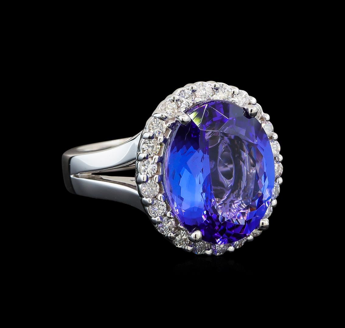 One electronically tested 14KT white gold lady's cast fashion ring with a split shank basket halo with a bright polish finish. The featured lady's ring has a shank measuring 3.62 millimeters wide. Identified with markings of '14K'. Condition is new, good workmanship. Containing: One prong set oval modified brilliant cut natural tanzanite, measuring 14.72 x 11.82 x 6.25mm, (depth est.) 7%. bulge factor, approximate weight of 8.19ct., clarity is eye clean, medium, very slightly grayish, violetish blue color, (GIA vB 5/3), cut is very good. Transmitting light with no distortion, transparent. Colored gemstones are presumed to have been subjected to commonly used enhancement processes. Graded loose prior to setting in the GIA Laboratory, Report #2175568352. Twenty-Two prong set round brilliant cut diamonds, measuring 1.95 - 1.85 x 1.18mm (depth est.) approximate total weight of 22 Stones = 0.57ct. Graded in the setting. Clarity SI-1 to I-1. Color: H - I Cut Good. Total Weight of Colored Stones 8.19ct.. Total Weight of Diamonds 0.57ct.. Total Weight of Ring 11.00gm. GAS Appraised at $15,590.00.