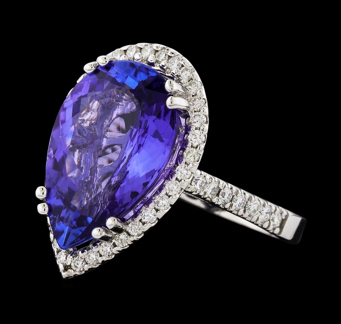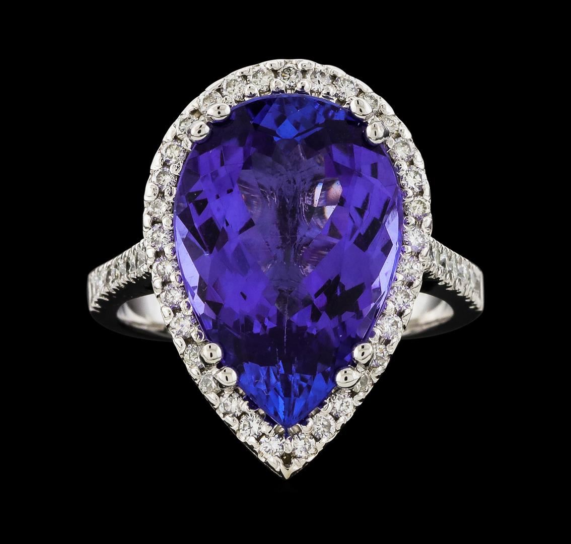 One electronically tested 14KT white gold lady's cast fashion ring with a basket halo with a bright polish finish. The featured lady's ring has a shank measuring 2.27 millimeters wide. Identified with markings of '14K'. Condition is new, good workmanship. Containing: One prong set pear modified brilliant cut natural tanzanite, measuring 16.72 x 11.34 x 6.55mm, (depth est.) approximate weight of 8.25ct., clarity is eye clean, medium, moderately strong, violet color, (GIA V 5/4), cut is very good. Transmitting light with no distortion, transparent. Colored gemstones are presumed to have been subjected to commonly used enhancement processes. Graded loose prior to setting in the GIA Laboratory, Report #1172847906. Fourteen prong set round brilliant cut diamonds, measuring 1.60 - 1.50 x 0.96mm (depth est.) approximate total weight of 14 Stones = 0.20ct. Graded in the setting. Clarity SI-1 to SI-2. Color: G - H Cut Good Thirty-Five prong set round brilliant cut diamonds, measuring 1.40 - 1.30 x 0.84mm (depth est.) approximate total weight of 35 Stones = 0.34ct. Graded in the setting. Clarity SI-1 to SI-3. Color: G - H Cut Good. Total Weight of Colored Stones 8.25ct.. Total Weight of Diamonds 0.54ct.. Total Weight of Ring 6.40gm. GAS Appraised at $12,675.00.