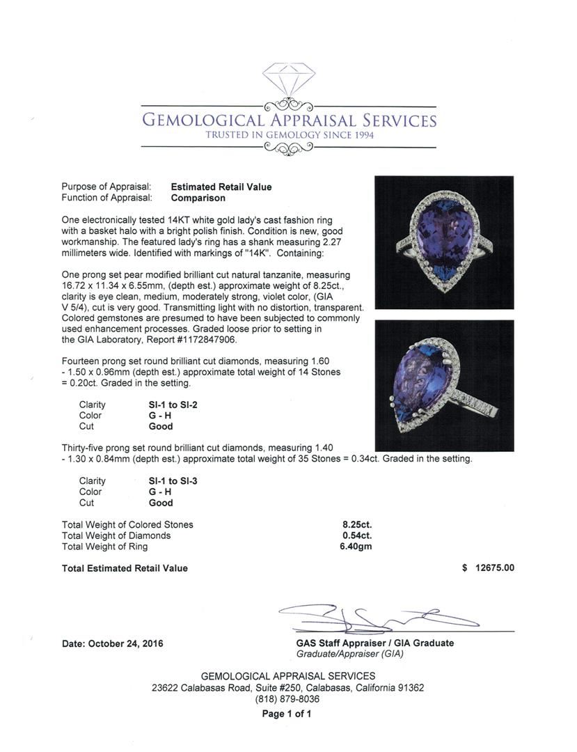 One electronically tested 14KT white gold lady's cast fashion ring with a basket halo with a bright polish finish. The featured lady's ring has a shank measuring 2.27 millimeters wide. Identified with markings of '14K'. Condition is new, good workmanship. Containing: One prong set pear modified brilliant cut natural tanzanite, measuring 16.72 x 11.34 x 6.55mm, (depth est.) approximate weight of 8.25ct., clarity is eye clean, medium, moderately strong, violet color, (GIA V 5/4), cut is very good. Transmitting light with no distortion, transparent. Colored gemstones are presumed to have been subjected to commonly used enhancement processes. Graded loose prior to setting in the GIA Laboratory, Report #1172847906. Fourteen prong set round brilliant cut diamonds, measuring 1.60 - 1.50 x 0.96mm (depth est.) approximate total weight of 14 Stones = 0.20ct. Graded in the setting. Clarity SI-1 to SI-2. Color: G - H Cut Good Thirty-Five prong set round brilliant cut diamonds, measuring 1.40 - 1.30 x 0.84mm (depth est.) approximate total weight of 35 Stones = 0.34ct. Graded in the setting. Clarity SI-1 to SI-3. Color: G - H Cut Good. Total Weight of Colored Stones 8.25ct.. Total Weight of Diamonds 0.54ct.. Total Weight of Ring 6.40gm. GAS Appraised at $12,675.00.