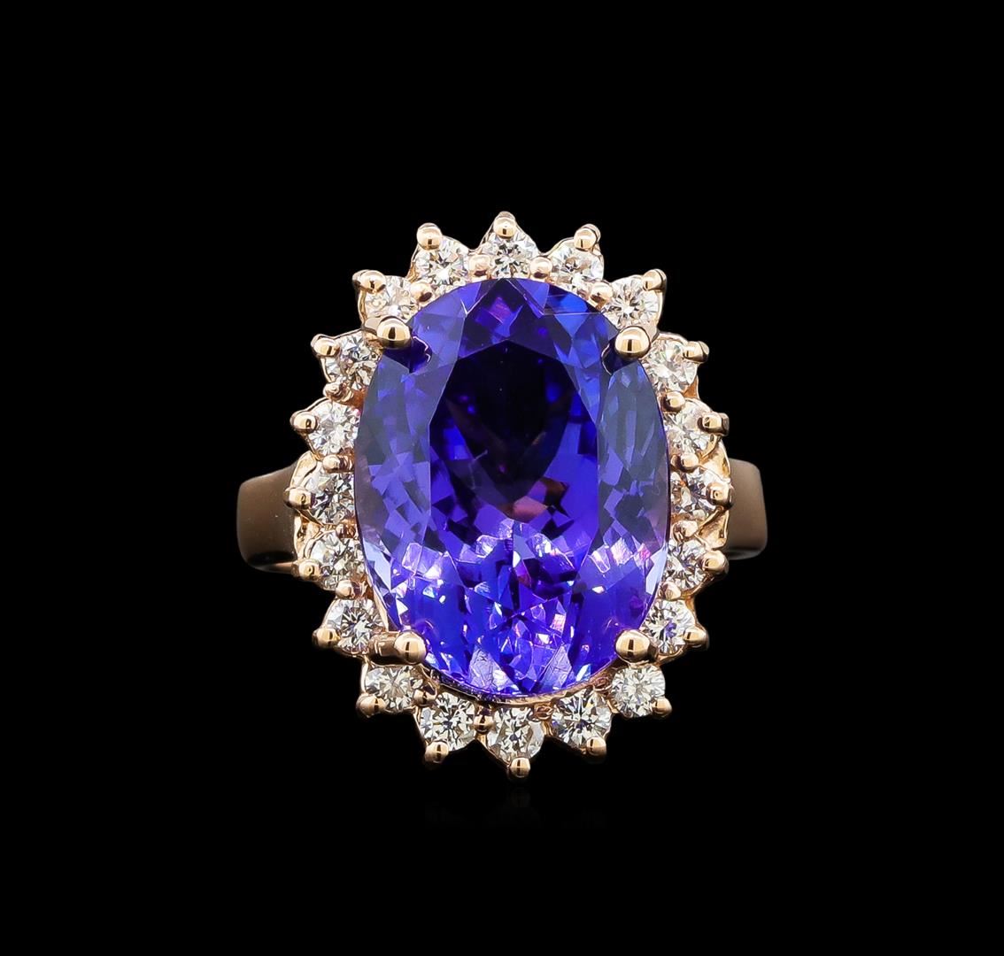 One electronically tested 14KT rose gold lady's cast fashion ring with a basket halo with a bright polish finish. The featured lady's ring has a shank measuring 3.10 millimeters wide. Identified with markings of '14K'. Condition is new, good workmanship. Containing: One prong set oval modified brilliant cut natural tanzanite, measuring 14.06 x 10.66 x 7.80mm, (depth est.) approximate weight of 8.31ct., clarity is eye clean, medium dark, moderately strong, bluish violet color, (GIA bV 6/4), cut is very good. Transmitting light with no distortion, transparent. Colored gemstones are presumed to have been subjected to commonly used enhancement processes. Graded loose prior to setting in the GIA Laboratory, Report #1176665827. Twenty prong set round brilliant cut diamonds, measuring 2.00 - 1.90 x 1.21mm (depth est.) approximate total weight of 20 Stones = 0.56ct. Graded in the setting. Clarity SI-1 to I-1. Color: H - I Cut Good. Total Weight of Colored Stones 8.31ct.. Total Weight of Diamonds 0.56ct.. Total Weight of Ring 7.10gm. GAS Appraised at $13,830.00.