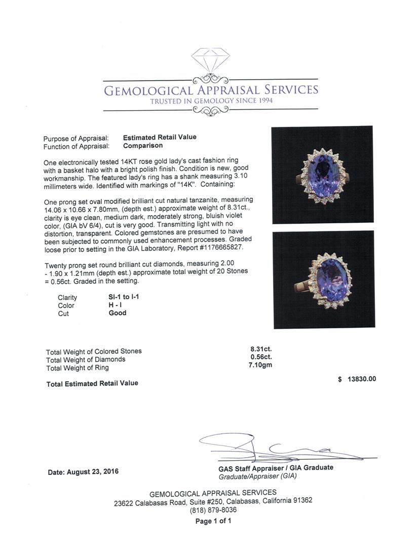 One electronically tested 14KT rose gold lady's cast fashion ring with a basket halo with a bright polish finish. The featured lady's ring has a shank measuring 3.10 millimeters wide. Identified with markings of '14K'. Condition is new, good workmanship. Containing: One prong set oval modified brilliant cut natural tanzanite, measuring 14.06 x 10.66 x 7.80mm, (depth est.) approximate weight of 8.31ct., clarity is eye clean, medium dark, moderately strong, bluish violet color, (GIA bV 6/4), cut is very good. Transmitting light with no distortion, transparent. Colored gemstones are presumed to have been subjected to commonly used enhancement processes. Graded loose prior to setting in the GIA Laboratory, Report #1176665827. Twenty prong set round brilliant cut diamonds, measuring 2.00 - 1.90 x 1.21mm (depth est.) approximate total weight of 20 Stones = 0.56ct. Graded in the setting. Clarity SI-1 to I-1. Color: H - I Cut Good. Total Weight of Colored Stones 8.31ct.. Total Weight of Diamonds 0.56ct.. Total Weight of Ring 7.10gm. GAS Appraised at $13,830.00.