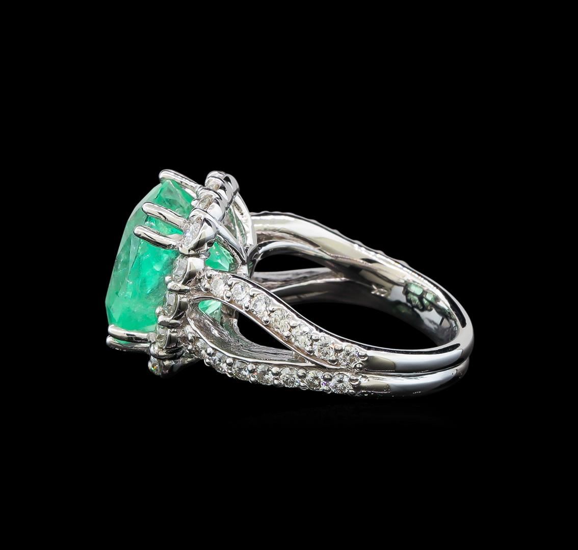 One electronically tested 14KT white gold lady's cast fashion ring with a split shank basket halo with a bright polish finish. The featured lady's ring has a double shank measuring 3.88 millimeters wide. Identified with markings of '14K'. Condition is new, good workmanship. Containing: One prong set square cushion modified brilliant cut natural emerald, measuring 12.46 x 11.40 x 9.47mm, (depth est.) approximate weight of 8.37ct., clarity is moderately included, medium light, moderately strong, green color, (GIA G 4/4), cut is good. Transmitting light somewhat diffusely, transparent to translucent. Naturally occurring internal & external characteristics are present. Clarity enhanced. Colored gemstones are presumed to have been subjected to commonly used enhancement processes. Graded loose prior to setting in the GIA Laboratory, Report #5171664610. Sixteen prong set round brilliant cut diamonds, measuring 2.50 - 2.40 x 1.52mm (depth est.) approximate total weight of 16 Stones = 0.89ct. Graded in the setting. Clarity SI-1 to I-1. Color: H - I Cut Good Twenty-Eight prong set round brilliant cut diamonds, measuring 1.70 - 1.60 x 1.02mm (depth est.) approximate total weight of 28 Stones = 0.49ct. Graded in the setting. Clarity SI-1 to SI-2. Color: H - I Cut Good. Total Weight of Colored Stones 8.37ct.. Total Weight of Diamonds 1.38ct.. Total Weight of Ring 10.20gm. GAS Appraised at $15,295.00.
