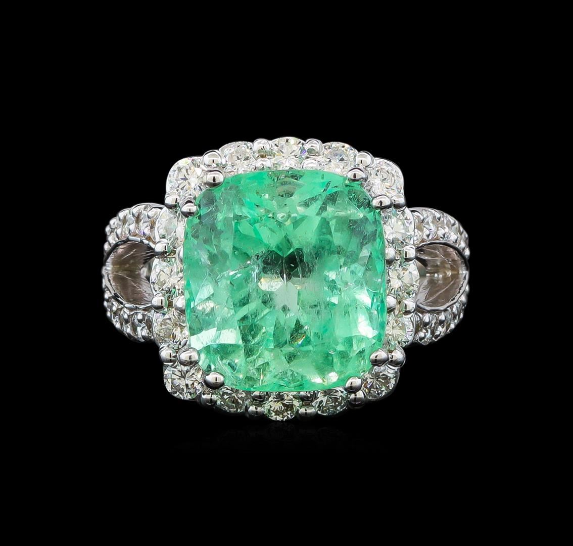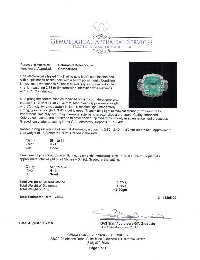One electronically tested 14KT white gold lady's cast fashion ring with a split shank basket halo with a bright polish finish. The featured lady's ring has a double shank measuring 3.88 millimeters wide. Identified with markings of '14K'. Condition is new, good workmanship. Containing: One prong set square cushion modified brilliant cut natural emerald, measuring 12.46 x 11.40 x 9.47mm, (depth est.) approximate weight of 8.37ct., clarity is moderately included, medium light, moderately strong, green color, (GIA G 4/4), cut is good. Transmitting light somewhat diffusely, transparent to translucent. Naturally occurring internal & external characteristics are present. Clarity enhanced. Colored gemstones are presumed to have been subjected to commonly used enhancement processes. Graded loose prior to setting in the GIA Laboratory, Report #5171664610. Sixteen prong set round brilliant cut diamonds, measuring 2.50 - 2.40 x 1.52mm (depth est.) approximate total weight of 16 Stones = 0.89ct. Graded in the setting. Clarity SI-1 to I-1. Color: H - I Cut Good Twenty-Eight prong set round brilliant cut diamonds, measuring 1.70 - 1.60 x 1.02mm (depth est.) approximate total weight of 28 Stones = 0.49ct. Graded in the setting. Clarity SI-1 to SI-2. Color: H - I Cut Good. Total Weight of Colored Stones 8.37ct.. Total Weight of Diamonds 1.38ct.. Total Weight of Ring 10.20gm. GAS Appraised at $15,295.00.