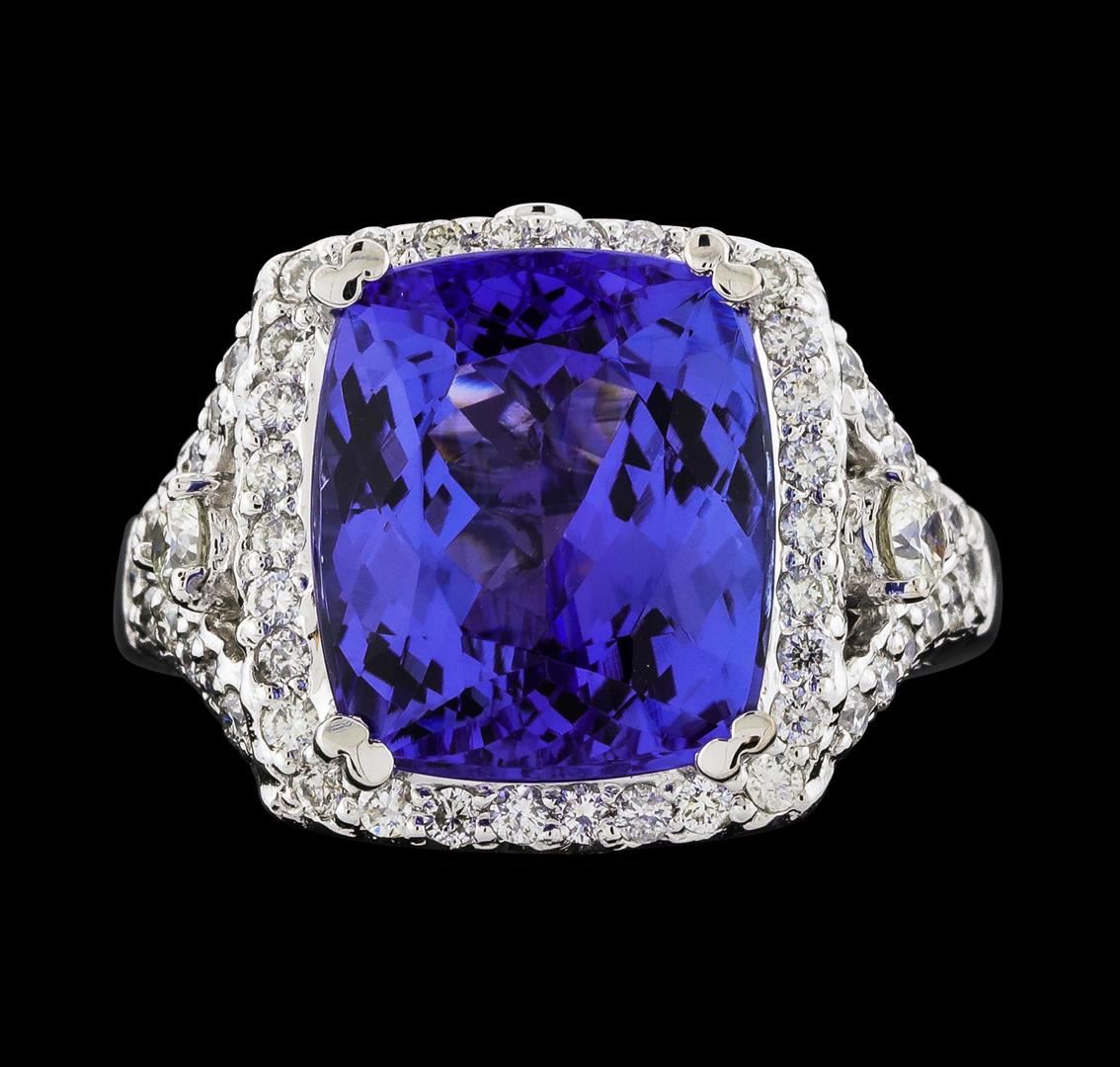 One electronically tested 14KT white gold lady's cast fashion ring with a cathedral shank with a basket halo with a bright polish finish. The featured lady's ring has a shank measuring 2.08 millimeters wide. Identified with markings of '14K'. Condition is new, good workmanship. Containing: One prong set rectangular cushion modified brilliant cut natural tanzanite, measuring 12.88 x 11.11 x 6.90mm, (depth est.) 7%. bulge factor, approximate weight of 8.38ct., clarity is eye clean, medium, moderately strong, bluish violet color, (GIA bV 5/4), cut is very good. Transmitting light with no distortion, transparent. Colored gemstones are presumed to have been subjected to commonly used enhancement processes. Graded loose prior to setting in the GIA Laboratory, Report #5172847062. Two prong set round brilliant cut diamonds, measuring 2.90 - 2.85 x 1.79mm (depth est.) approximate total weight of 2 Stones = 0.18ct. Graded in the setting. Clarity SI-1. Color: H - I Cut Good Fifty-Two prong set round brilliant cut diamonds, measuring 1.50 - 1.45 x 0.90mm (depth est.) approximate total weight of 52 Stones = 0.62ct. Graded in the setting. Clarity SI-1 to SI-2. Color: H - I Cut Good. Total Weight of Colored Stones 8.38ct.. Total Weight of Diamonds 0.80ct.. Total Weight of Ring 9.60gm. GAS Appraised at $14,015.00.