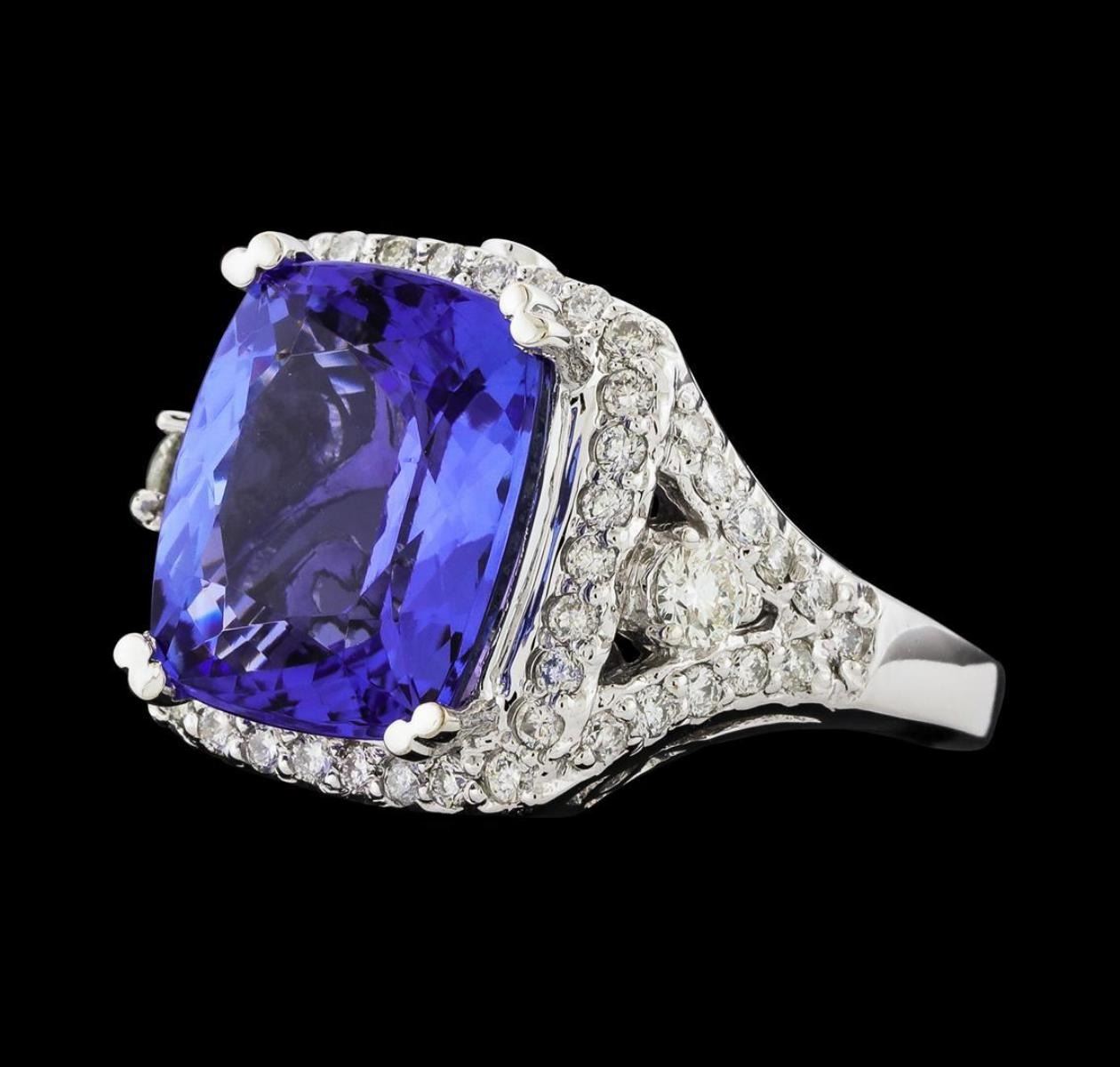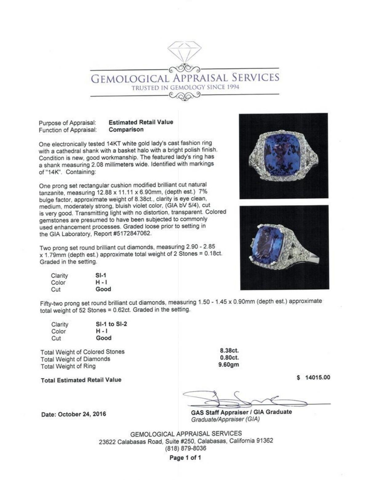 One electronically tested 14KT white gold lady's cast fashion ring with a cathedral shank with a basket halo with a bright polish finish. The featured lady's ring has a shank measuring 2.08 millimeters wide. Identified with markings of '14K'. Condition is new, good workmanship. Containing: One prong set rectangular cushion modified brilliant cut natural tanzanite, measuring 12.88 x 11.11 x 6.90mm, (depth est.) 7%. bulge factor, approximate weight of 8.38ct., clarity is eye clean, medium, moderately strong, bluish violet color, (GIA bV 5/4), cut is very good. Transmitting light with no distortion, transparent. Colored gemstones are presumed to have been subjected to commonly used enhancement processes. Graded loose prior to setting in the GIA Laboratory, Report #5172847062. Two prong set round brilliant cut diamonds, measuring 2.90 - 2.85 x 1.79mm (depth est.) approximate total weight of 2 Stones = 0.18ct. Graded in the setting. Clarity SI-1. Color: H - I Cut Good Fifty-Two prong set round brilliant cut diamonds, measuring 1.50 - 1.45 x 0.90mm (depth est.) approximate total weight of 52 Stones = 0.62ct. Graded in the setting. Clarity SI-1 to SI-2. Color: H - I Cut Good. Total Weight of Colored Stones 8.38ct.. Total Weight of Diamonds 0.80ct.. Total Weight of Ring 9.60gm. GAS Appraised.