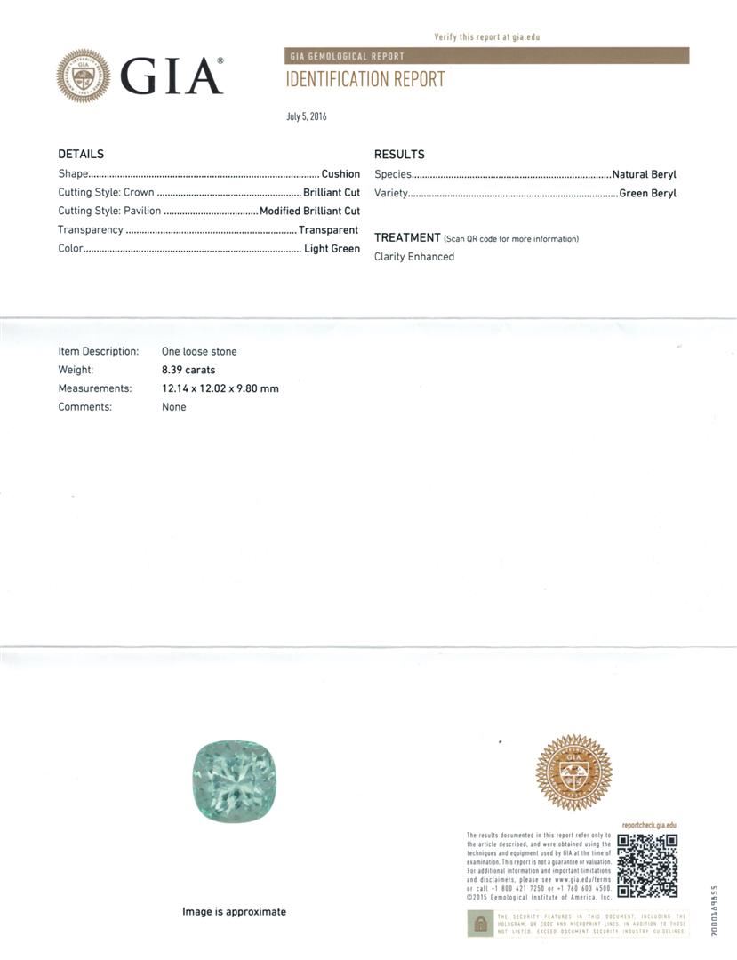 One electronically tested 14KT white gold lady's cast fashion ring with a split shank basket halo with a bright polish finish. The featured lady's ring has a double shank measuring 3.65 millimeters wide. Identified with markings of '14K'. Condition is new, good workmanship. Containing: One prong set square cushion modified brilliant cut natural emerald, measuring 12.14 x 12.02 x 9.80mm, (depth est.) approximate weight of 8.39ct., clarity is moderately included, light, moderately strong, green color, (GIA G 3/4), cut is good. Transmitting light somewhat diffusely, transparent to translucent. Naturally occurring internal & external characteristics are present. Clarity enhanced. Colored gemstones are presumed to have been subjected to commonly used enhancement processes. Graded loose prior to setting in the GIA Laboratory, Report #5172664536. Sixteen prong set round brilliant cut diamonds, measuring 2.60 - 2.50 x 1.58mm (depth est.) approximate total weight of 16 Stones = 1.06ct. Graded in the setting. Clarity SI-1 to I-1. Color: H - I Cut Good Twenty-Eight prong set round brilliant cut diamonds, measuring 1.70 - 1.60 x 1.02mm (depth est.) approximate total weight of 28 Stones = 0.49ct. Graded in the setting. Clarity SI-1 to SI-2. Color: H - I Cut Good. Total Weight of Colored Stones 8.39ct.. Total Weight of Diamonds 1.55ct.. Total Weight of Ring 10.60gm. GAS Appraised at $15,030.00.