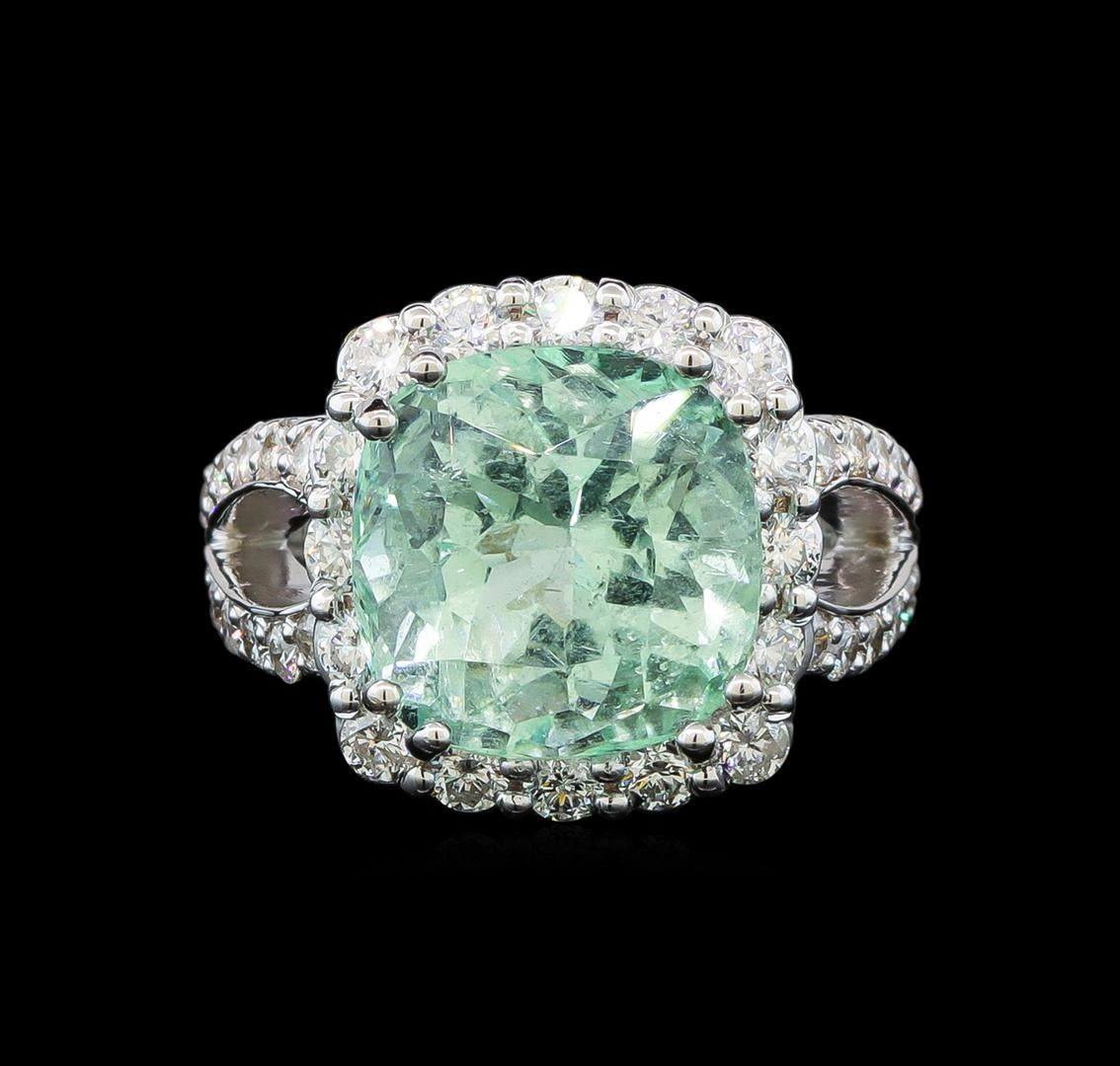 One electronically tested 14KT white gold lady's cast fashion ring with a split shank basket halo with a bright polish finish. The featured lady's ring has a double shank measuring 3.65 millimeters wide. Identified with markings of '14K'. Condition is new, good workmanship. Containing: One prong set square cushion modified brilliant cut natural emerald, measuring 12.14 x 12.02 x 9.80mm, (depth est.) approximate weight of 8.39ct., clarity is moderately included, light, moderately strong, green color, (GIA G 3/4), cut is good. Transmitting light somewhat diffusely, transparent to translucent. Naturally occurring internal & external characteristics are present. Clarity enhanced. Colored gemstones are presumed to have been subjected to commonly used enhancement processes. Graded loose prior to setting in the GIA Laboratory, Report #5172664536. Sixteen prong set round brilliant cut diamonds, measuring 2.60 - 2.50 x 1.58mm (depth est.) approximate total weight of 16 Stones = 1.06ct. Graded in the setting. Clarity SI-1 to I-1. Color: H - I Cut Good Twenty-Eight prong set round brilliant cut diamonds, measuring 1.70 - 1.60 x 1.02mm (depth est.) approximate total weight of 28 Stones = 0.49ct. Graded in the setting. Clarity SI-1 to SI-2. Color: H - I Cut Good. Total Weight of Colored Stones 8.39ct.. Total Weight of Diamonds 1.55ct.. Total Weight of Ring 10.60gm. GAS Appraised at $15,030.00.