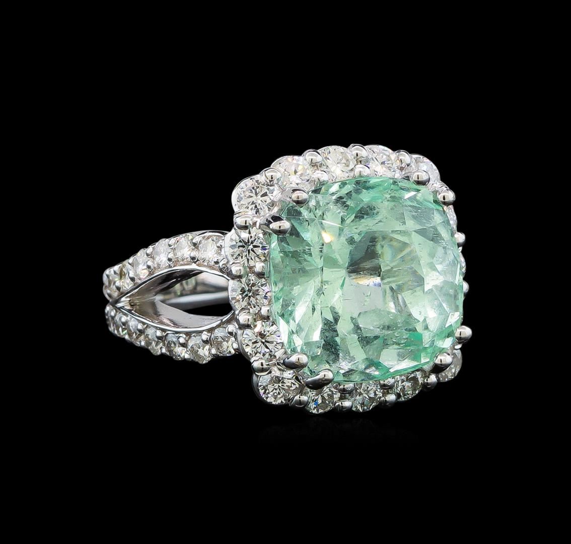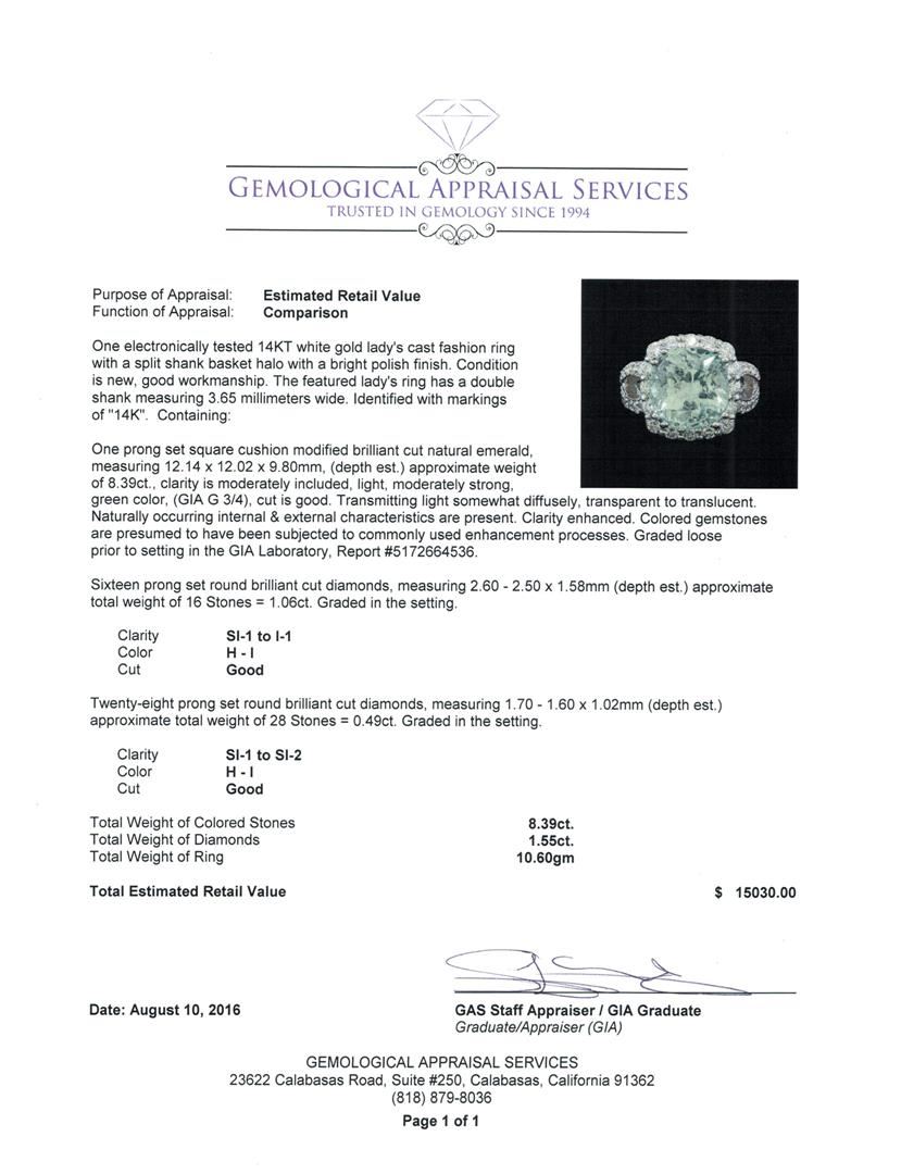 One electronically tested 14KT white gold lady's cast fashion ring with a split shank basket halo with a bright polish finish. The featured lady's ring has a double shank measuring 3.65 millimeters wide. Identified with markings of '14K'. Condition is new, good workmanship. Containing: One prong set square cushion modified brilliant cut natural emerald, measuring 12.14 x 12.02 x 9.80mm, (depth est.) approximate weight of 8.39ct., clarity is moderately included, light, moderately strong, green color, (GIA G 3/4), cut is good. Transmitting light somewhat diffusely, transparent to translucent. Naturally occurring internal & external characteristics are present. Clarity enhanced. Colored gemstones are presumed to have been subjected to commonly used enhancement processes. Graded loose prior to setting in the GIA Laboratory, Report #5172664536. Sixteen prong set round brilliant cut diamonds, measuring 2.60 - 2.50 x 1.58mm (depth est.) approximate total weight of 16 Stones = 1.06ct. Graded in the setting. Clarity SI-1 to I-1. Color: H - I Cut Good Twenty-Eight prong set round brilliant cut diamonds, measuring 1.70 - 1.60 x 1.02mm (depth est.) approximate total weight of 28 Stones = 0.49ct. Graded in the setting. Clarity SI-1 to SI-2. Color: H - I Cut Good. Total Weight of Colored Stones 8.39ct.. Total Weight of Diamonds 1.55ct.. Total Weight of Ring 10.60gm. GAS Appraised at $15,030.00.