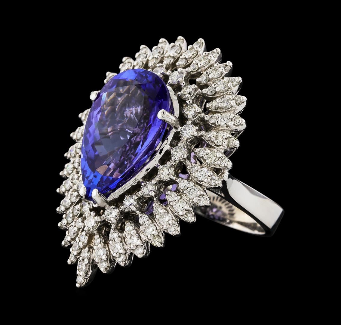 One electronically tested 14KT white gold lady's cast fashion ring with a triple basket halo with a bright polish finish. The featured lady's ring has a shank measuring 3.26 millimeters wide. Identified with markings of 'K14'. Condition is new, good workmanship. Containing: One prong set pear modified brilliant cut natural tanzanite, measuring 16.90 x 10.93 x 6.92mm, (depth est.) approximate weight of 8.48ct., clarity is eye clean, medium, moderately strong, violetish blue color, (GIA vB 5/4), cut is very good. Transmitting light with no distortion, transparent. Colored gemstones are presumed to have been subjected to commonly used enhancement processes. Graded loose prior to setting in the GIA Laboratory, Report #1172847783. Nineteen prong set round brilliant cut diamonds, measuring 2.00 - 1.90 x 1.21mm (depth est.) approximate total weight of 19 Stones = 0.53ct. Graded in the setting. Clarity SI-1 to SI-2. Color: H - I Cut Good Thirty-Two prong set round brilliant cut diamonds, measuring 1.70 - 1.60 x 1.02mm (depth est.) approximate total weight of 32 Stones = 0.54ct. Graded in the setting. Clarity SI-1 to SI-2. Color: H - I Cut Good Sixty-Four prong set round brilliant cut diamonds, measuring 1.25 - 1.15 x 0.72mm (depth est.) approximate total weight of 64 Stones = 0.40ct. Graded in the setting. Clarity SI-1 to I-1. Color: H - I Cut Good. Total Weight of Colored Stones 8.48ct.. Total Weight of Diamonds 1.47ct.. Total Weight of Ring 12.90gm. GAS Appraised at $16,550.00.