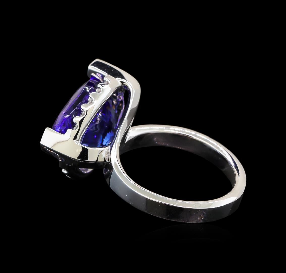 One electronically tested 14KT white gold lady's cast fashion ring with a halo with a bright polish finish. The featured lady's ring has a shank measuring 3.18 millimeters wide. Identified with markings of '14K'. Condition is new, good workmanship. Containing: One prong set pear modified brilliant cut natural tanzanite, measuring 12.81 x 13.45 x 8.06mm, (depth est.) approximate weight of 8.52ct., clarity is eye clean, medium dark, moderately strong, violetish blue color, (GIA vB 6/4), cut is very good. Transmitting light with no distortion, transparent. Colored gemstones are presumed to have been subjected to commonly used enhancement processes. Graded loose prior to setting in the GIA Laboratory, Report #2171668310. Fifteen prong set round brilliant cut diamonds, measuring 1.80 - 1.70 x 1.09mm (depth est.) approximate total weight of 15 Stones = 0.30ct. Graded in the setting. Clarity SI-1 to I-1. Color: H - I Cut Good. Total Weight of Colored Stones 8.52ct.. Total Weight of Diamonds 0.30ct.. Total Weight of Ring 9.40gm. GAS Appraised at $16,710.00.