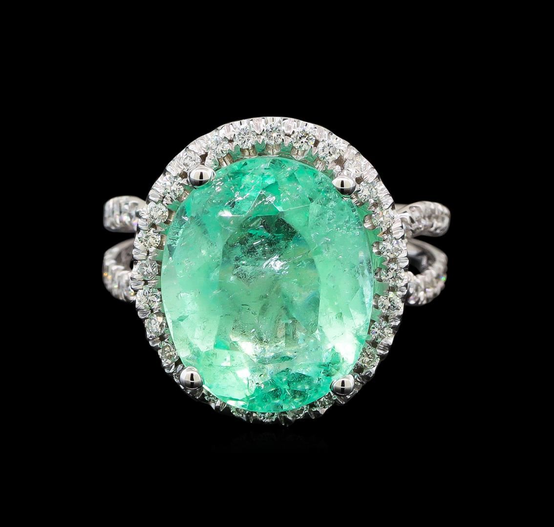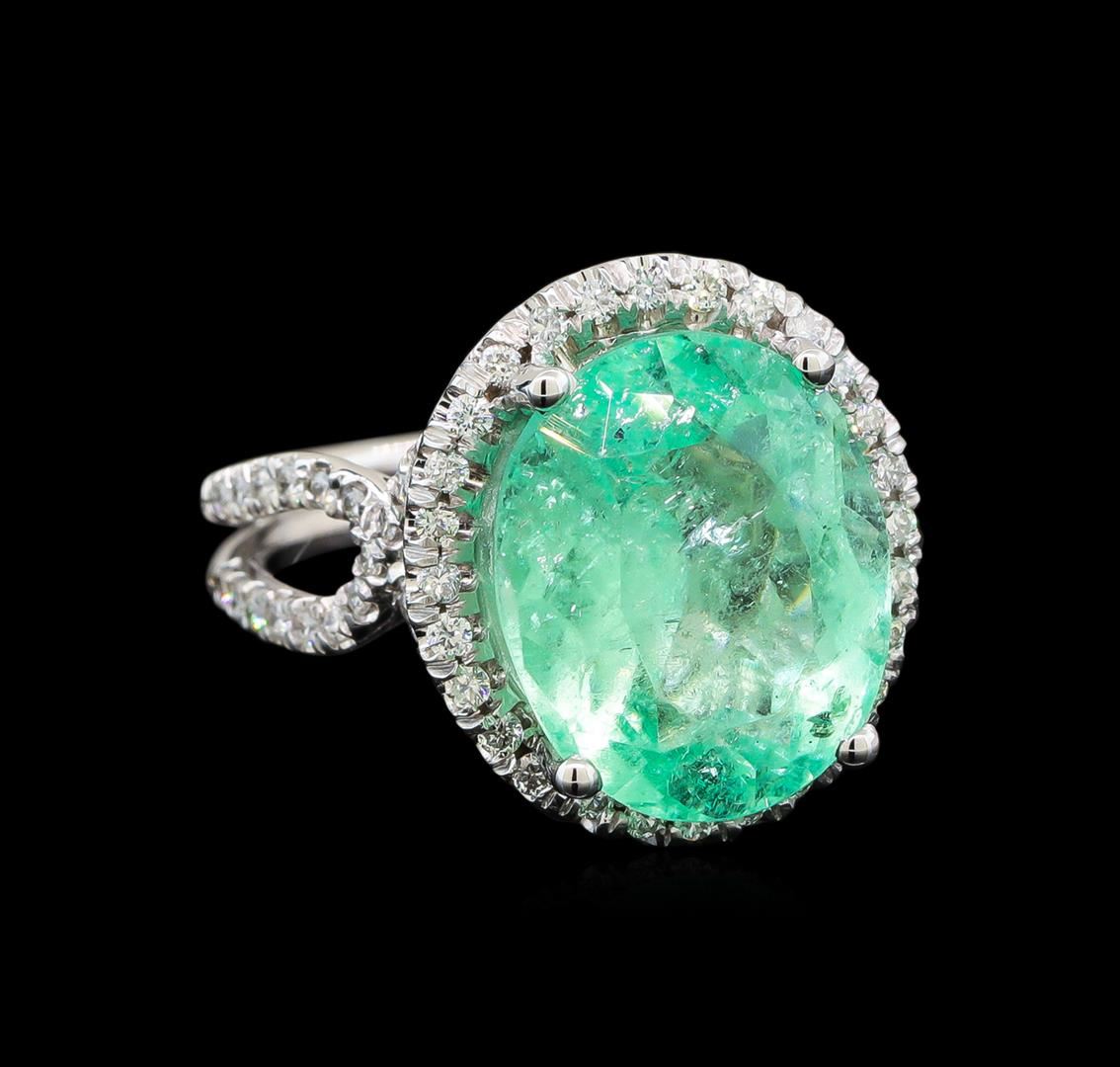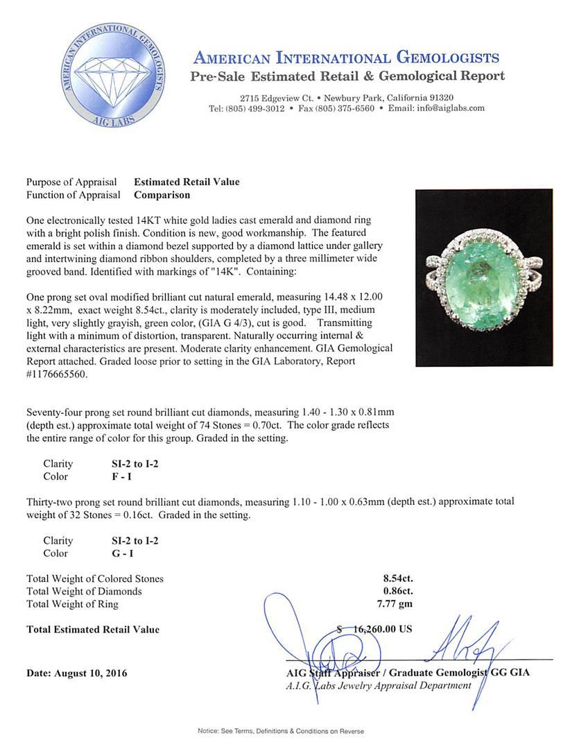 One electronically tested 14KT white gold ladies cast emerald and diamond ring with a bright polish finish. The featured emerald is set within a diamond bezel supported by a diamond lattice under gallery and intertwining diamond ribbon shoulders, completed by a three millimeter wide grooved band. Identified with markings of '14K'. Condition is new, good workmanship. Containing: One prong set oval modified brilliant cut natural emerald, measuring 14.48 x 12.00 x 8.22mm, exact weight 8.54ct., clarity is moderately included, type III, medium light, very slightly grayish, green color, (GIA G 4/3), cut is good. Transmitting light with a minimum of distortion, transparent. Naturally occurring internal & external characteristics are present. Moderate clarity enhancement. GIA Gemological Report attached. Graded loose prior to setting in the GIA Laboratory, Report #1176665560. Seventy-Four prong set round brilliant cut diamonds, measuring 1.40 - 1.30 x 0.81mm (depth est.) approximate total weight of 74 Stones = 0.70ct. The color grade reflects the entire range of color for this group. Graded in the setting. Clarity SI-2 to I-2. Color: F - I Thirty-Two prong set round brilliant cut diamonds, measuring 1.10 - 1.00 x 0.63mm (depth est.) approximate total weight of 32 Stones = 0.16ct. Graded in the setting. Clarity SI-2 to I-2. Color: G - I. Total Weight of Colored Stones 8.54ct.. Total Weight of Diamonds 0.86ct.. Total Weight of Ring 7.77gm. AIG Appraised at $16,260.00.