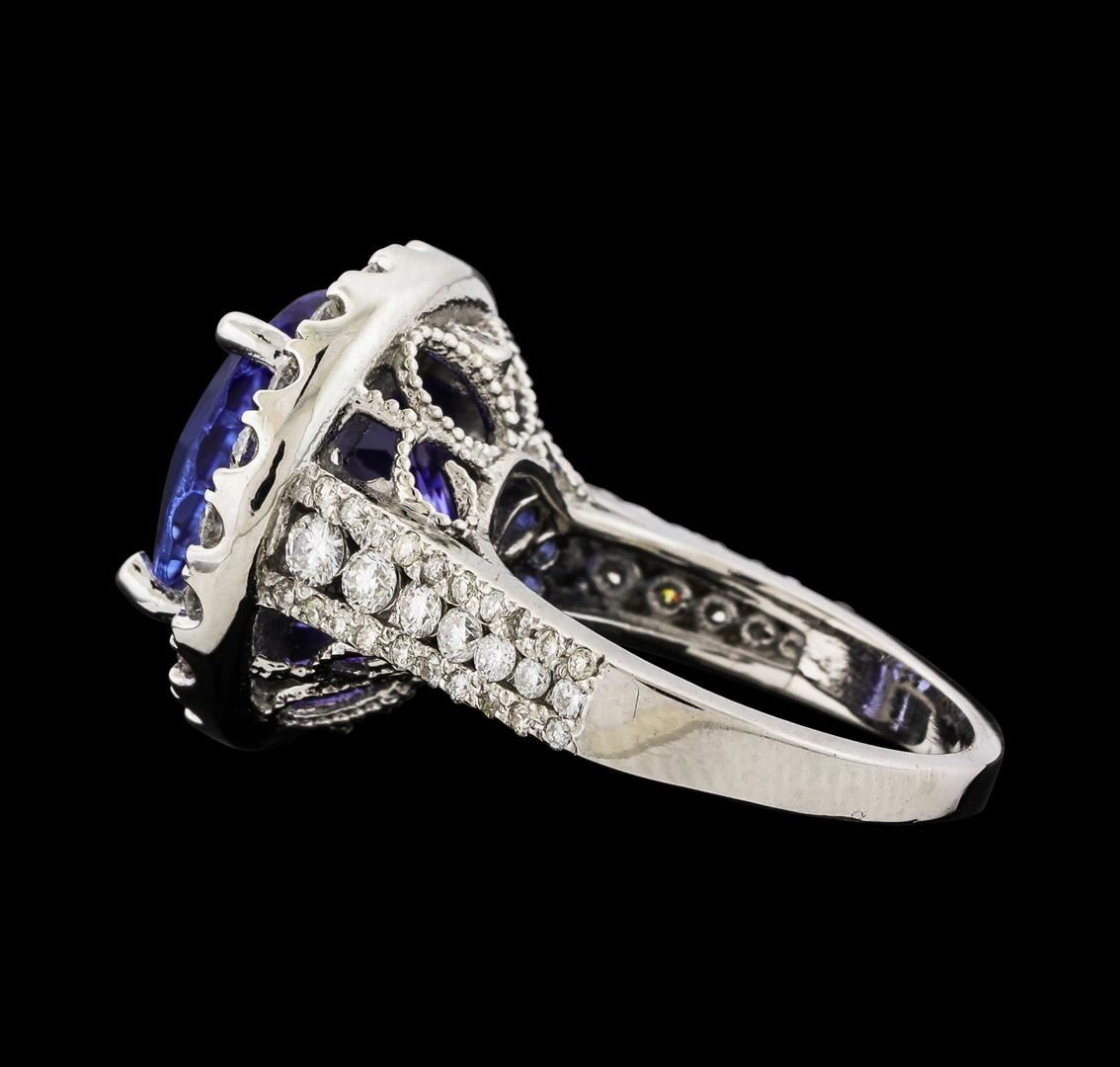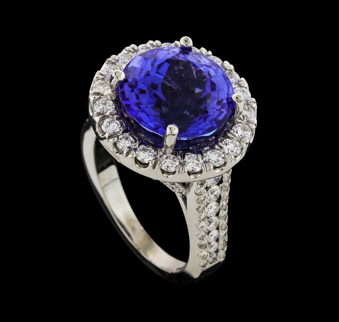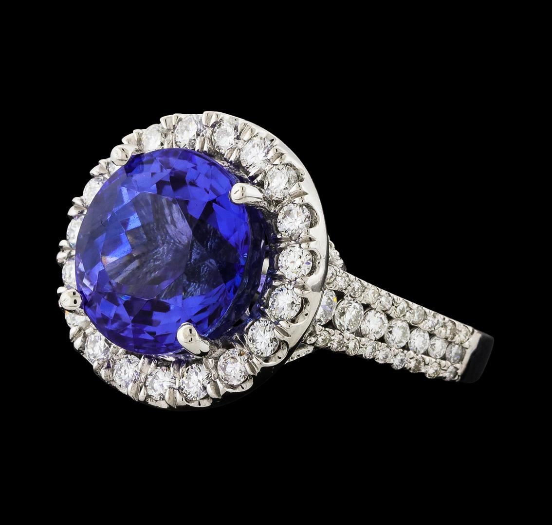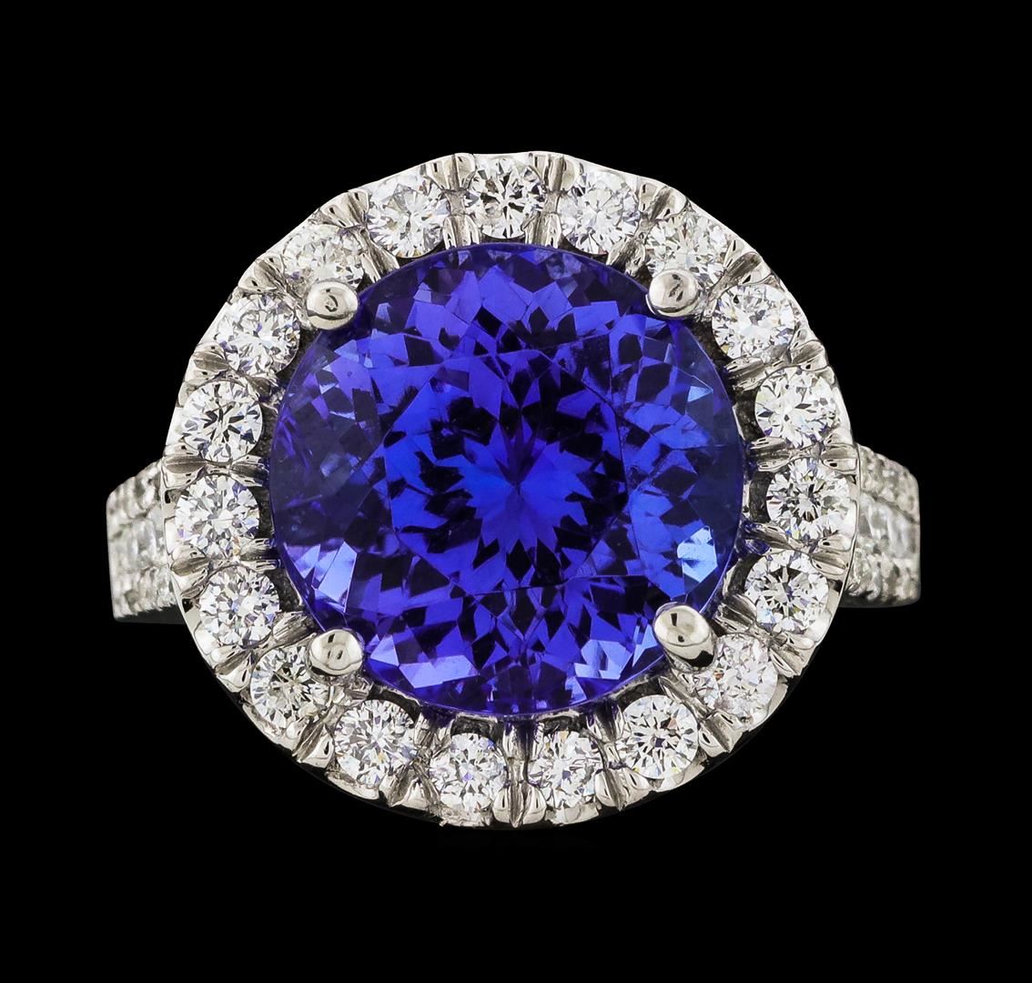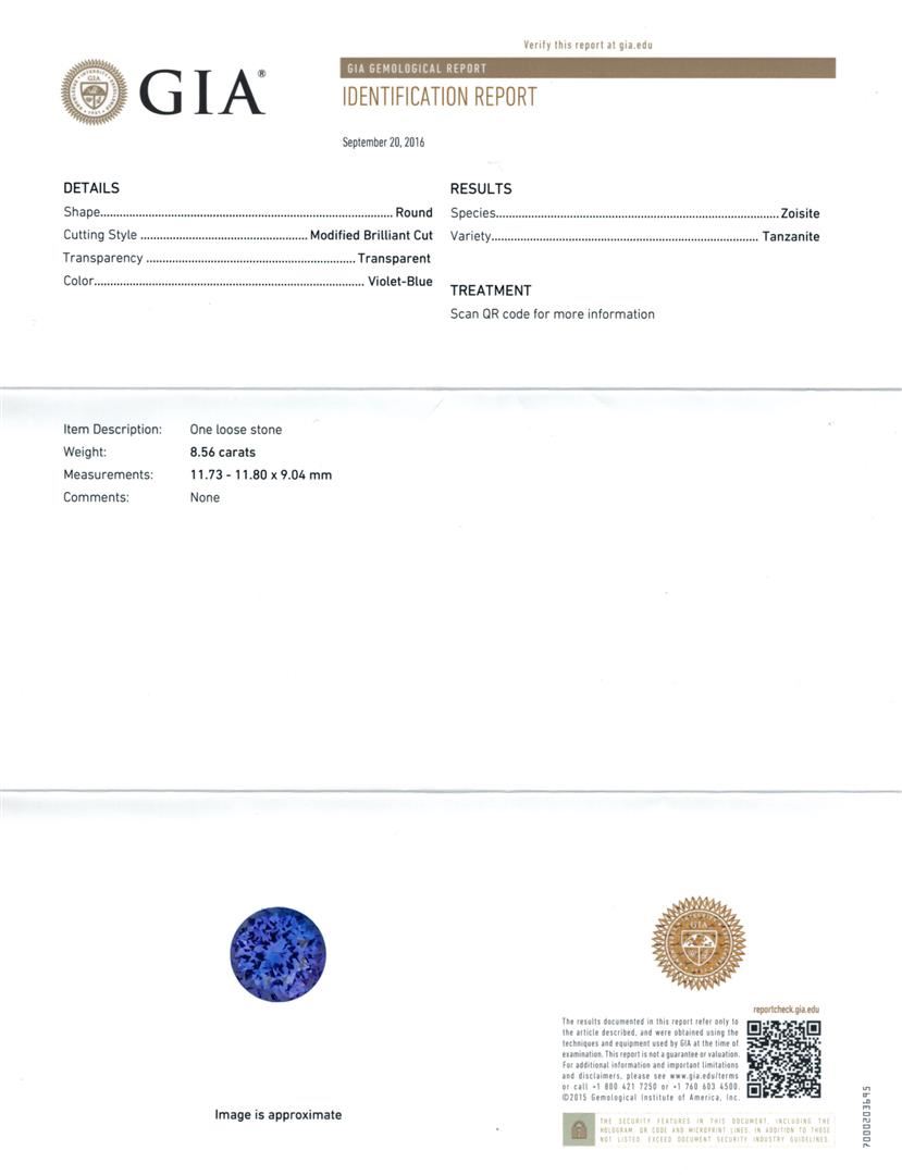 One electronically tested 14KT white gold lady's cast fashion ring with a cathedral shank with a basket halo with a bright polish with milgrain detailing finish. The featured lady's ring has a shank measuring 2.27 millimeters wide. Identified with markings of '14K'. Condition is new, good workmanship. Containing: One prong set round modified brilliant cut natural tanzanite, measuring 11.80 - 11.73 x 9.04 mm, (depth est.) approximate weight of 8.56ct., clarity is eye clean, medium dark, moderately strong, violetish blue color, (GIA vB 6/4), cut is very good. Transmitting light with no distortion, transparent. Colored gemstones are presumed to have been subjected to commonly used enhancement processes. Graded loose prior to setting in the GIA Laboratory, Report #2175847777. Twenty-Three prong set round brilliant cut diamonds, measuring 2.35 - 2.05 x 1.32mm (depth est.) approximate total weight of 23 Stones = 0.88ct. Graded in the setting. Clarity SI-1 to I-1. Color: G - H Cut Good Twelve prong set round brilliant cut diamonds, measuring 1.90 - 1.30 x 0.96mm (depth est.) approximate total weight of 12 Stones = 0.18ct. Graded in the setting. Clarity SI-1 to I-1. Color: G - I Cut Good Forty prong set round brilliant cut diamonds, measuring 1.00 - 0.95 x 0.61mm (depth est.) approximate total weight of 40 Stones = 0.14ct. Graded in the setting. Clarity SI-1 to SI-3. Color: H - I Cut Good. Total Weight of Colored Stones 8.56ct.. Total Weight of Diamonds 1.20ct.. Total Weight of Ring 9.90gm. GAS Appraised at $16,385.00.