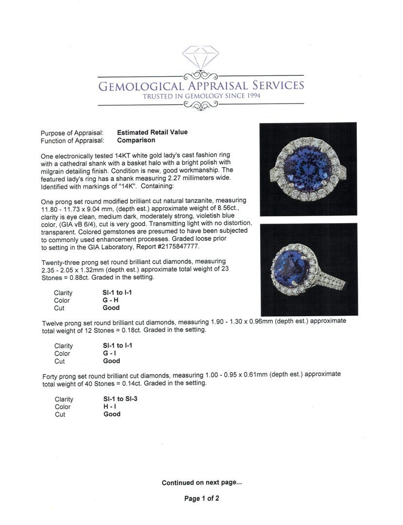 One electronically tested 14KT white gold lady's cast fashion ring with a cathedral shank with a basket halo with a bright polish with milgrain detailing finish. The featured lady's ring has a shank measuring 2.27 millimeters wide. Identified with markings of '14K'. Condition is new, good workmanship. Containing: One prong set round modified brilliant cut natural tanzanite, measuring 11.80 - 11.73 x 9.04 mm, (depth est.) approximate weight of 8.56ct., clarity is eye clean, medium dark, moderately strong, violetish blue color, (GIA vB 6/4), cut is very good. Transmitting light with no distortion, transparent. Colored gemstones are presumed to have been subjected to commonly used enhancement processes. Graded loose prior to setting in the GIA Laboratory, Report #2175847777. Twenty-Three prong set round brilliant cut diamonds, measuring 2.35 - 2.05 x 1.32mm (depth est.) approximate total weight of 23 Stones = 0.88ct. Graded in the setting. Clarity SI-1 to I-1. Color: G - H Cut Good Twelve prong set round brilliant cut diamonds, measuring 1.90 - 1.30 x 0.96mm (depth est.) approximate total weight of 12 Stones = 0.18ct. Graded in the setting. Clarity SI-1 to I-1. Color: G - I Cut Good Forty prong set round brilliant cut diamonds, measuring 1.00 - 0.95 x 0.61mm (depth est.) approximate total weight of 40 Stones = 0.14ct. Graded in the setting. Clarity SI-1 to SI-3. Color: H - I Cut Good. Total Weight of Colored Stones 8.56ct.. Total Weight of Diamonds 1.20ct.. Total Weight of Ring 9.90gm. GAS Appraised at $16,385.00.