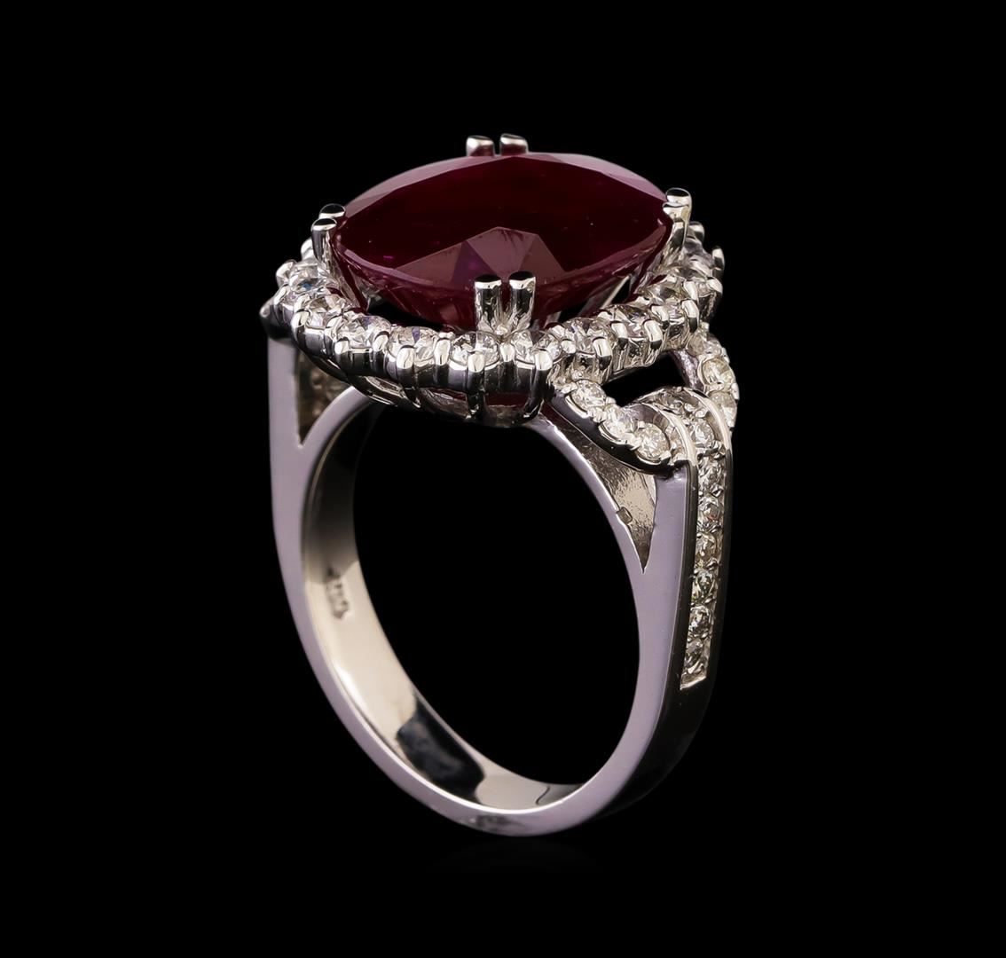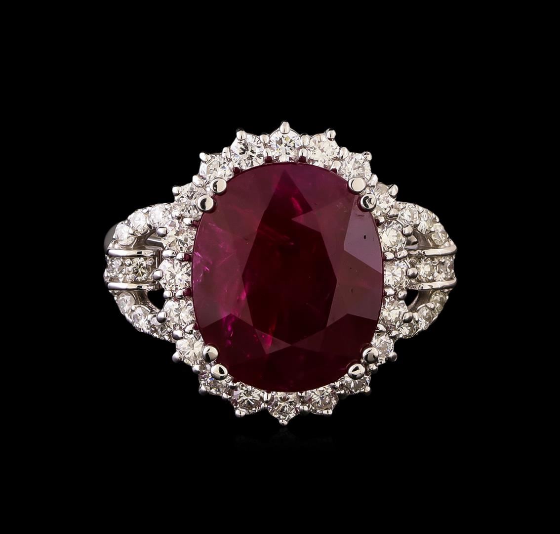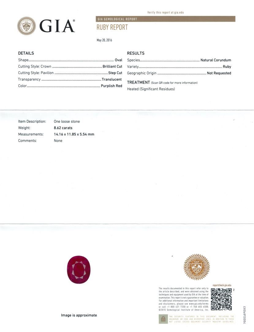 One electronically tested 14KT white gold lady's cast fashion ring with a split shank cathedral basket halo with a bright polish finish. The featured lady's ring has a shank measuring 3.58 millimeters in width. Identified with markings of 'K14'. Condition is new, good workmanship. Containing: One prong set oval modified mixed cut natural ruby, measuring 14.16 x 11.85 x 5.54mm, (depth est.) 10%. bulge factor, approximate weight of 8.62ct., clarity is heavily included, medium dark, moderately strong, slightly purplish red color, (GIA slpR 6/4), cut is very good. Transmitting light somewhat diffusely, transparent to translucent. Indications of laboratory high temperature heat treatment. Naturally occurring internal & external characteristics are present. Colored gemstones are presumed to have been subjected to commonly used enhancement processes. Graded loose prior to setting in the GIA Laboratory, Report #5171603381. Twenty prong set round brilliant cut diamonds, measuring 2.20 - 2.15 x 1.35mm (depth est.) approximate total weight of 20 Stones = 0.77ct. Graded in the setting. Clarity SI-1 to SI-2. Color: H - I Cut Good Twenty-Eight prong set round brilliant cut diamonds, measuring 1.60 - 1.55 x 0.98mm (depth est.) approximate total weight of 28 Stones = 0.42ct. Graded in the setting. Clarity SI-1 to I-1. Color: H - I Cut Good. Total Weight of Colored Stones 8.62ct.. Total Weight of Diamonds 1.19ct.. Total Weight of Ring 8.90gm. GAS Appraised at $25,490.00.