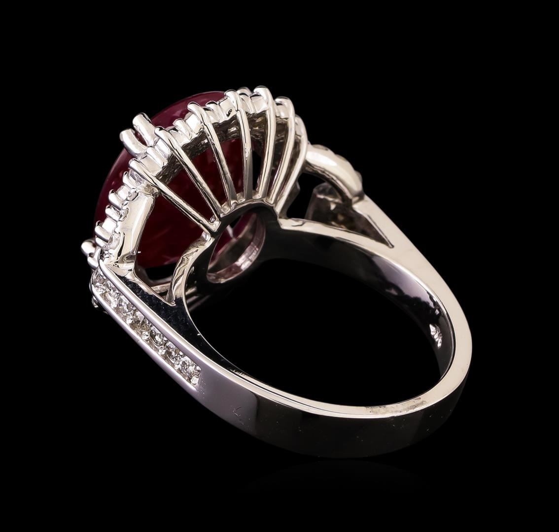 One electronically tested 14KT white gold lady's cast fashion ring with a split shank cathedral basket halo with a bright polish finish. The featured lady's ring has a shank measuring 3.58 millimeters in width. Identified with markings of 'K14'. Condition is new, good workmanship. Containing: One prong set oval modified mixed cut natural ruby, measuring 14.16 x 11.85 x 5.54mm, (depth est.) 10%. bulge factor, approximate weight of 8.62ct., clarity is heavily included, medium dark, moderately strong, slightly purplish red color, (GIA slpR 6/4), cut is very good. Transmitting light somewhat diffusely, transparent to translucent. Indications of laboratory high temperature heat treatment. Naturally occurring internal & external characteristics are present. Colored gemstones are presumed to have been subjected to commonly used enhancement processes. Graded loose prior to setting in the GIA Laboratory, Report #5171603381. Twenty prong set round brilliant cut diamonds, measuring 2.20 - 2.15 x 1.35mm (depth est.) approximate total weight of 20 Stones = 0.77ct. Graded in the setting. Clarity SI-1 to SI-2. Color: H - I Cut Good Twenty-Eight prong set round brilliant cut diamonds, measuring 1.60 - 1.55 x 0.98mm (depth est.) approximate total weight of 28 Stones = 0.42ct. Graded in the setting. Clarity SI-1 to I-1. Color: H - I Cut Good. Total Weight of Colored Stones 8.62ct.. Total Weight of Diamonds 1.19ct.. Total Weight of Ring 8.90gm. GAS Appraised at $25,490.00.