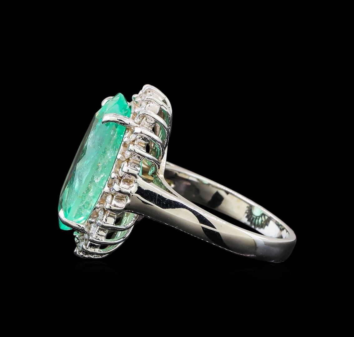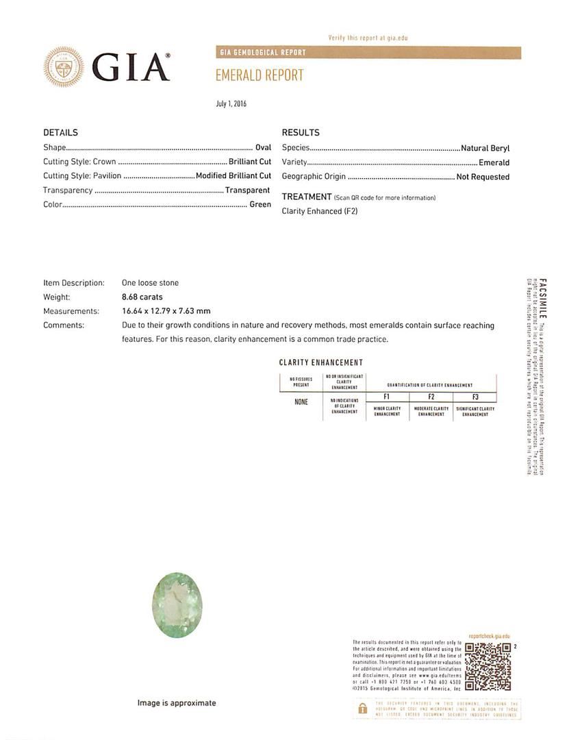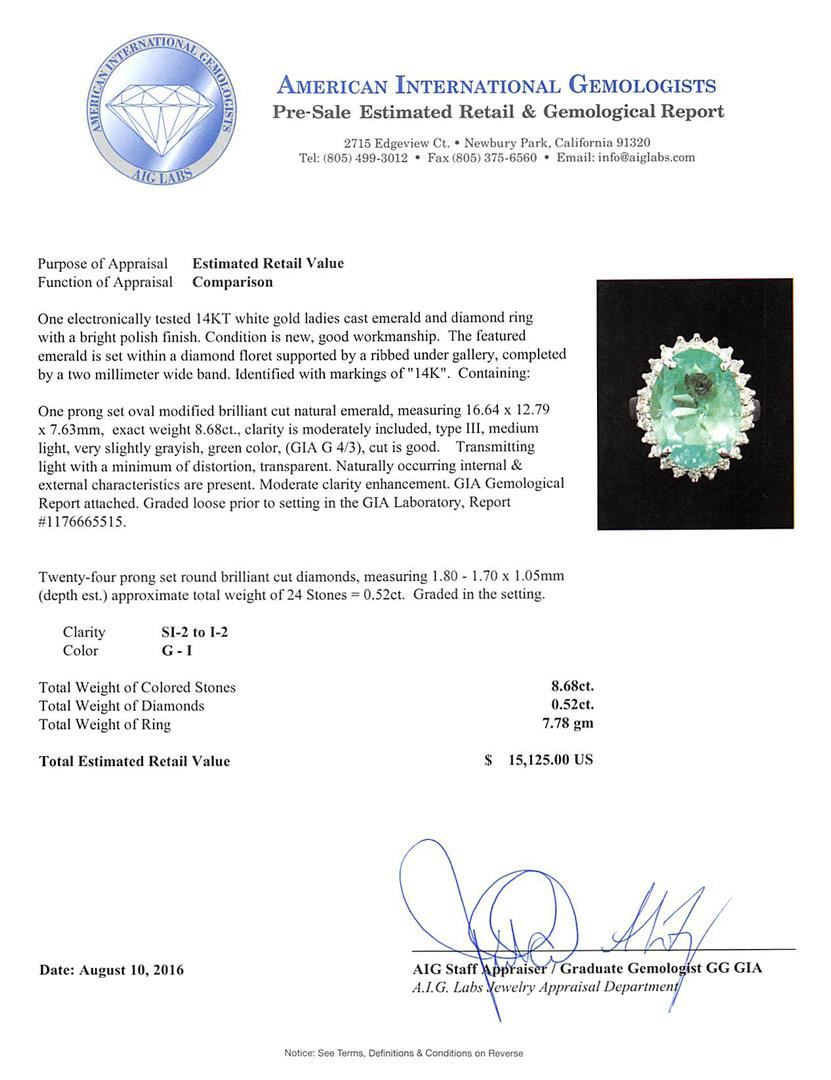 One electronically tested 14KT white gold ladies cast emerald and diamond ring with a bright polish finish. The featured emerald is set within a diamond floret supported by a ribbed under gallery, completed by a two millimeter wide band. Identified with markings of '14K'. Condition is new, good workmanship. Containing: One prong set oval modified brilliant cut natural emerald, measuring 16.64 x 12.79 x 7.63mm, exact weight 8.68ct., clarity is moderately included, type III, medium light, very slightly grayish, green color, (GIA G 4/3), cut is good. Transmitting light with a minimum of distortion, transparent. Naturally occurring internal & external characteristics are present. Moderate clarity enhancement. GIA Gemological Report attached. Graded loose prior to setting in the GIA Laboratory, Report #1176665515. Twenty-Four prong set round brilliant cut diamonds, measuring 1.80 - 1.70 x 1.05mm (depth est.) approximate total weight of 24 Stones = 0.52ct. Graded in the setting. Clarity SI-2 to I-2. Color: G - I. Total Weight of Colored Stones 8.68ct.. Total Weight of Diamonds 0.52ct.. Total Weight of Ring 7.78gm. AIG Appraised at $15,125.00.