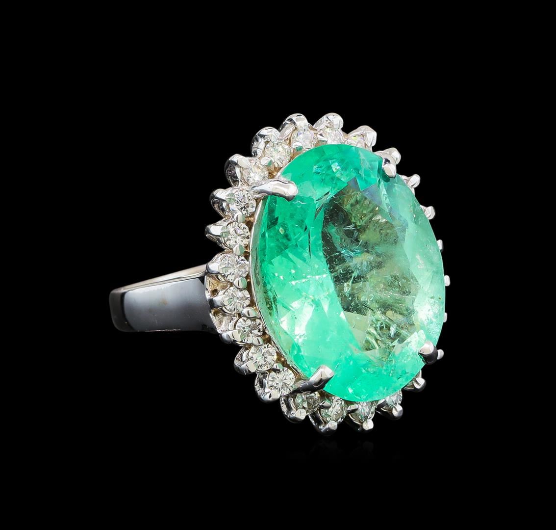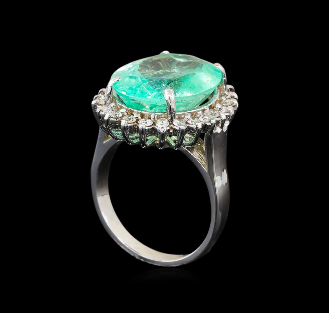 One electronically tested 14KT white gold ladies cast emerald and diamond ring with a bright polish finish. The featured emerald is set within a diamond floret supported by a ribbed under gallery, completed by a two millimeter wide band. Identified with markings of '14K'. Condition is new, good workmanship. Containing: One prong set oval modified brilliant cut natural emerald, measuring 16.64 x 12.79 x 7.63mm, exact weight 8.68ct., clarity is moderately included, type III, medium light, very slightly grayish, green color, (GIA G 4/3), cut is good. Transmitting light with a minimum of distortion, transparent. Naturally occurring internal & external characteristics are present. Moderate clarity enhancement. GIA Gemological Report attached. Graded loose prior to setting in the GIA Laboratory, Report #1176665515. Twenty-Four prong set round brilliant cut diamonds, measuring 1.80 - 1.70 x 1.05mm (depth est.) approximate total weight of 24 Stones = 0.52ct. Graded in the setting. Clarity SI-2 to I-2. Color: G - I. Total Weight of Colored Stones 8.68ct.. Total Weight of Diamonds 0.52ct.. Total Weight of Ring 7.78gm. AIG Appraised at $15,125.00.