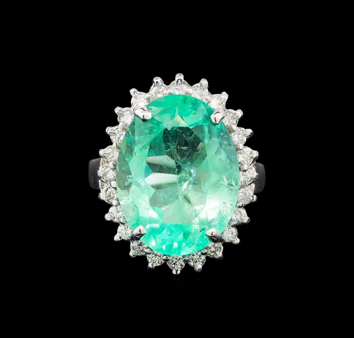 One electronically tested 14KT white gold ladies cast emerald and diamond ring with a bright polish finish. The featured emerald is set within a diamond floret supported by a ribbed under gallery, completed by a two millimeter wide band. Identified with markings of '14K'. Condition is new, good workmanship. Containing: One prong set oval modified brilliant cut natural emerald, measuring 16.64 x 12.79 x 7.63mm, exact weight 8.68ct., clarity is moderately included, type III, medium light, very slightly grayish, green color, (GIA G 4/3), cut is good. Transmitting light with a minimum of distortion, transparent. Naturally occurring internal & external characteristics are present. Moderate clarity enhancement. GIA Gemological Report attached. Graded loose prior to setting in the GIA Laboratory, Report #1176665515. Twenty-Four prong set round brilliant cut diamonds, measuring 1.80 - 1.70 x 1.05mm (depth est.) approximate total weight of 24 Stones = 0.52ct. Graded in the setting. Clarity SI-2 to I-2. Color: G - I. Total Weight of Colored Stones 8.68ct.. Total Weight of Diamonds 0.52ct.. Total Weight of Ring 7.78gm. AIG Appraised at $15,125.00.