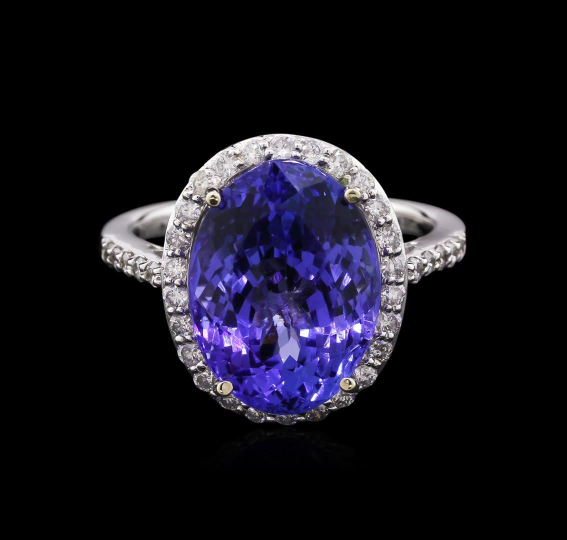 One electronically tested 14KT white gold ladies cast tanzanite and diamond ring with a bright polish finish. The featured tanzanite is set within a diamond bezel supported by a lattice under gallery and diamond set shoulders, completed by a two millimeter wide band. Trademark is Orianne. Identified with markings of "14K". Condition is new, good workmanship. Containing: One prong set oval modified brilliant cut natural tanzanite, measuring 14.32 x 10.56 x 7.93mm, exact weight 8.68ct., clarity is eye clean, type I, medium dark, very slightly grayish, violetish blue color, (GIA vB 6/3), cut is good. Transmitting light with no distortion, transparent. GIA Gemological Report attached. Graded loose prior to setting in the GIA Laboratory, Report #6177165235.Tanzanite is a very rare gemstone that is only found in the country of Tanzania. Originally discovered in 1967. Tiffany & Company, named the stone Tanzanite. It is found in the Usumburu Mountains that border the Umba Valley of northern Tanzania. Tanzanite occurs in gray, brown, violet, blue, reddish-purple, & green. The gem is interesting because of its exceptional pleochroism. Rotated in different directions a tanzanite will exhibit multiple changes of color. Tanzanite has a low tolerance to ultrasonic cleaning, and should not be cleaned using this method. Thirty-Six prong set round brilliant cut diamonds approximate total weight of 36 Stones = 0.51ct. Graded in the setting. Clarity: SI-2 to I-1. Color: G - I. Total Weight of Colored Stones 8.68ct. Total Weight of Diamonds 0.51ct. Total Weight of Ring 5.56gm. AIG Appraised at $22,805.00.