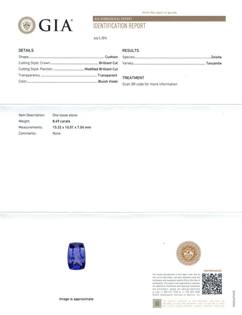 One electronically tested 14KT white gold lady's cast fashion ring with a cathedral split shank with a bright polish finish. The featured lady's ring has a double shank measuring 2.85 millimeters wide. Identified with markings of '14K'. Condition is new, good workmanship. Containing: One prong set rectangular cushion modified brilliant cut natural tanzanite, measuring 15.32 x 10.01 x 7.04mm, (depth est.) approximate weight of 8.69ct., clarity is eye clean, medium dark, moderately strong, bluish violet color, (GIA bV 6/4), cut is very good. Transmitting light with no distortion, transparent. Colored gemstones are presumed to have been subjected to commonly used enhancement processes. Graded loose prior to setting in the GIA Laboratory, Report #2175665666. Thirty-Six prong set round brilliant cut diamonds, measuring 1.50 - 1.45 x 0.92mm (depth est.) approximate total weight of 36 Stones = 0.44ct. Graded in the setting. Clarity SI-1 to I-1. Color: G - I Cut Good Fifty-Two prong set round brilliant cut diamonds, measuring 1.10 - 1.05 x 0.67mm (depth est.) approximate total weight of 52 Stones = 0.24ct. Graded in the setting. Clarity SI-1 to I-1. Color: G - I Cut Good. Total Weight of Colored Stones 8.69ct.. Total Weight of Diamonds 0.68ct.. Total Weight of Ring 7.10gm. GAS Appraised at $17,695.00.