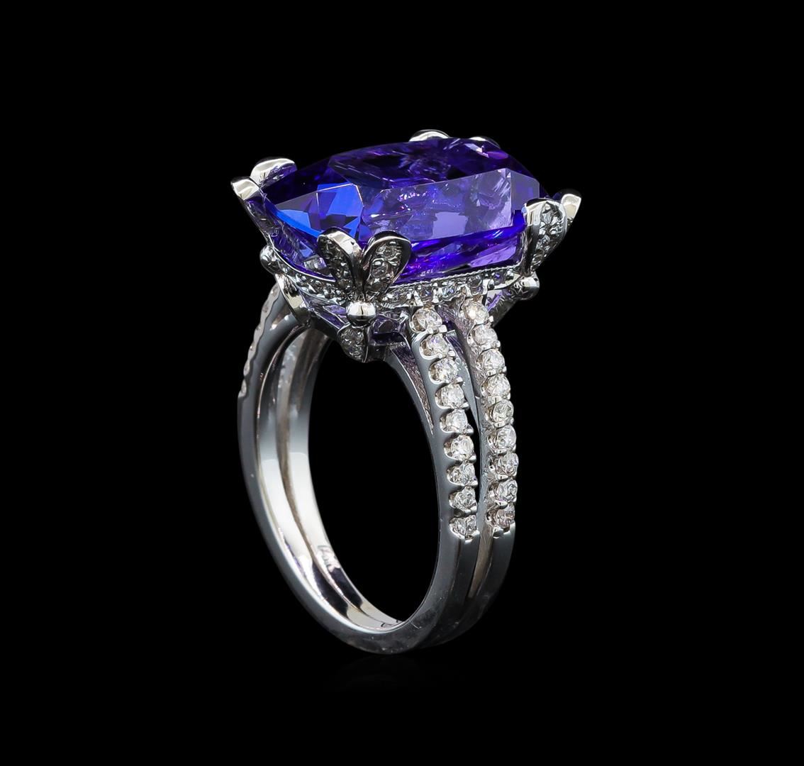 One electronically tested 14KT white gold lady's cast fashion ring with a cathedral split shank with a bright polish finish. The featured lady's ring has a double shank measuring 2.85 millimeters wide. Identified with markings of '14K'. Condition is new, good workmanship. Containing: One prong set rectangular cushion modified brilliant cut natural tanzanite, measuring 15.32 x 10.01 x 7.04mm, (depth est.) approximate weight of 8.69ct., clarity is eye clean, medium dark, moderately strong, bluish violet color, (GIA bV 6/4), cut is very good. Transmitting light with no distortion, transparent. Colored gemstones are presumed to have been subjected to commonly used enhancement processes. Graded loose prior to setting in the GIA Laboratory, Report #2175665666. Thirty-Six prong set round brilliant cut diamonds, measuring 1.50 - 1.45 x 0.92mm (depth est.) approximate total weight of 36 Stones = 0.44ct. Graded in the setting. Clarity SI-1 to I-1. Color: G - I Cut Good Fifty-Two prong set round brilliant cut diamonds, measuring 1.10 - 1.05 x 0.67mm (depth est.) approximate total weight of 52 Stones = 0.24ct. Graded in the setting. Clarity SI-1 to I-1. Color: G - I Cut Good. Total Weight of Colored Stones 8.69ct.. Total Weight of Diamonds 0.68ct.. Total Weight of Ring 7.10gm. GAS Appraised at $17,695.00.