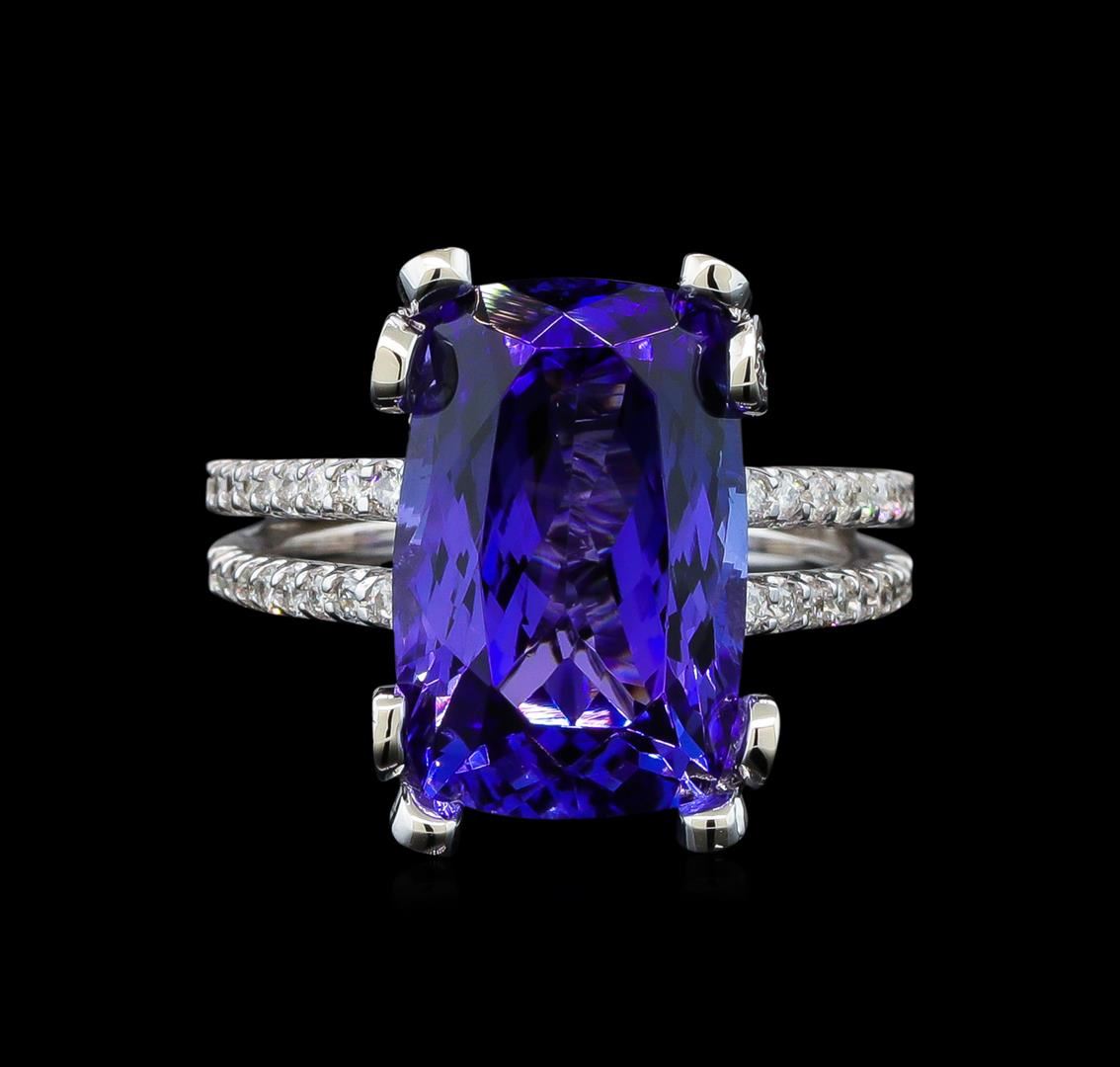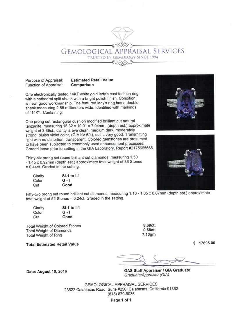 One electronically tested 14KT white gold lady's cast fashion ring with a cathedral split shank with a bright polish finish. The featured lady's ring has a double shank measuring 2.85 millimeters wide. Identified with markings of '14K'. Condition is new, good workmanship. Containing: One prong set rectangular cushion modified brilliant cut natural tanzanite, measuring 15.32 x 10.01 x 7.04mm, (depth est.) approximate weight of 8.69ct., clarity is eye clean, medium dark, moderately strong, bluish violet color, (GIA bV 6/4), cut is very good. Transmitting light with no distortion, transparent. Colored gemstones are presumed to have been subjected to commonly used enhancement processes. Graded loose prior to setting in the GIA Laboratory, Report #2175665666. Thirty-Six prong set round brilliant cut diamonds, measuring 1.50 - 1.45 x 0.92mm (depth est.) approximate total weight of 36 Stones = 0.44ct. Graded in the setting. Clarity SI-1 to I-1. Color: G - I Cut Good Fifty-Two prong set round brilliant cut diamonds, measuring 1.10 - 1.05 x 0.67mm (depth est.) approximate total weight of 52 Stones = 0.24ct. Graded in the setting. Clarity SI-1 to I-1. Color: G - I Cut Good. Total Weight of Colored Stones 8.69ct.. Total Weight of Diamonds 0.68ct.. Total Weight of Ring 7.10gm. GAS Appraised at $17,695.00.