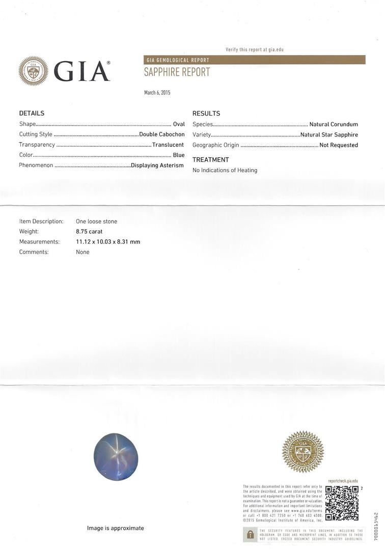 One electronically tested 18KT white gold lady's cast fashion ring with a tapered shank with a bright polish with milgrain detailing finish. The featured lady's ring measures 4.20 millimeters in width. Identified with markings of "18K 750". Condition is new, good workmanship. Containing: One prong set cabochon standard cut natural blue star sapphire, measuring 11.31 x 10.00 x 8.30mm, approximate weight of 8.75ct., clarity is slightly included, medium dark, very slightly grayish, bluish violet color, (GIA bV 6/3), cut is good. This stone has a complete six ray star with strong intensity and very good movement. Graded loose prior to setting in the GIA Laboratory, Report #6173050695.Forty-Eight channel set baguette cut diamonds, measuring from 2.90 x 1.10 x 0.80mm (depth est.) to 3.00 x 1.25 x 0.90mm (depth est.) approximate. Total Weight of 48 Stones = 1.28ct. Graded in the setting. Clarity: VS-1 to VS-2. Color: G - H. Cut Very Good One Hundred Fifty prong set round brilliant cut diamonds, measuring 1.60 - 1.30 x 0.87mm (depth est.) approximate. Total Weight of 150 Stones = 1.51ct. Graded in the setting. Clarity: VS-1 to VS-2. Color: F - Very Good. Total Weight of Colored Stones 8.75ct. Total Weight of Diamonds 2.79ct. Total Weight of Ring 11.70gm. GAS Appraised at $24,860.00.