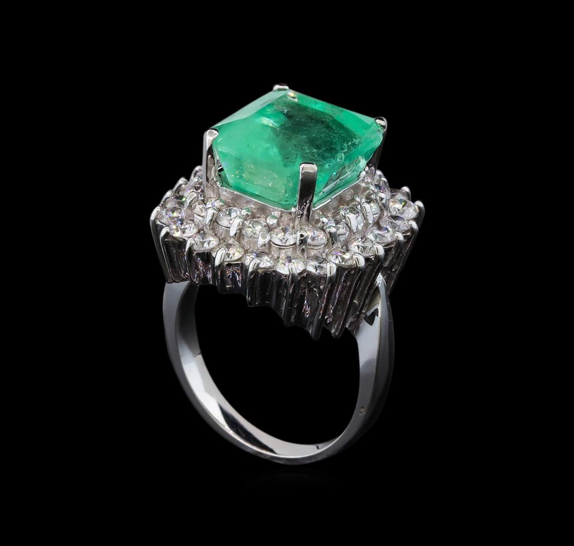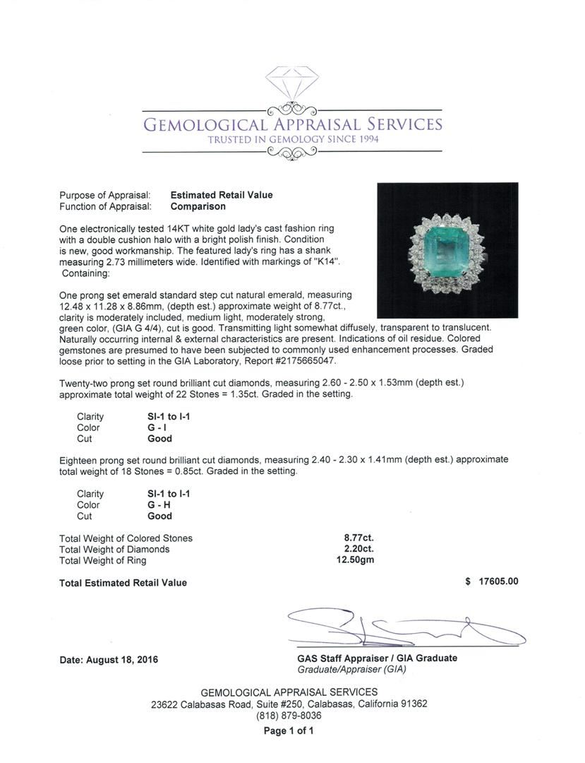 One electronically tested 14KT white gold lady's cast fashion ring with a double cushion halo with a bright polish finish. The featured lady's ring has a shank measuring 2.73 millimeters wide. Identified with markings of 'K14'. Condition is new, good workmanship. Containing: One prong set emerald standard step cut natural emerald, measuring 12.48 x 11.28 x 8.86mm, (depth est.) approximate weight of 8.77ct., clarity is moderately included, medium light, moderately strong, green color, (GIA G 4/4), cut is good. Transmitting light somewhat diffusely, transparent to translucent. Naturally occurring internal & external characteristics are present. Indications of oil residue. Colored gemstones are presumed to have been subjected to commonly used enhancement processes. Graded loose prior to setting in the GIA Laboratory, Report #2175665047. Twenty-Two prong set round brilliant cut diamonds, measuring 2.60 - 2.50 x 1.53mm (depth est.) approximate total weight of 22 Stones = 1.35ct. Graded in the setting. Clarity SI-1 to I-1. Color: G - I Cut Good Eighteen prong set round brilliant cut diamonds, measuring 2.40 - 2.30 x 1.41mm (depth est.) approximate total weight of 18 Stones = 0.85ct. Graded in the setting. Clarity SI-1 to I-1. Color: G - H Cut Good. Total Weight of Colored Stones 8.77ct.. Total Weight of Diamonds 2.20ct.. Total Weight of Ring 12.50gm. GAS Appraised at $17,605.00.