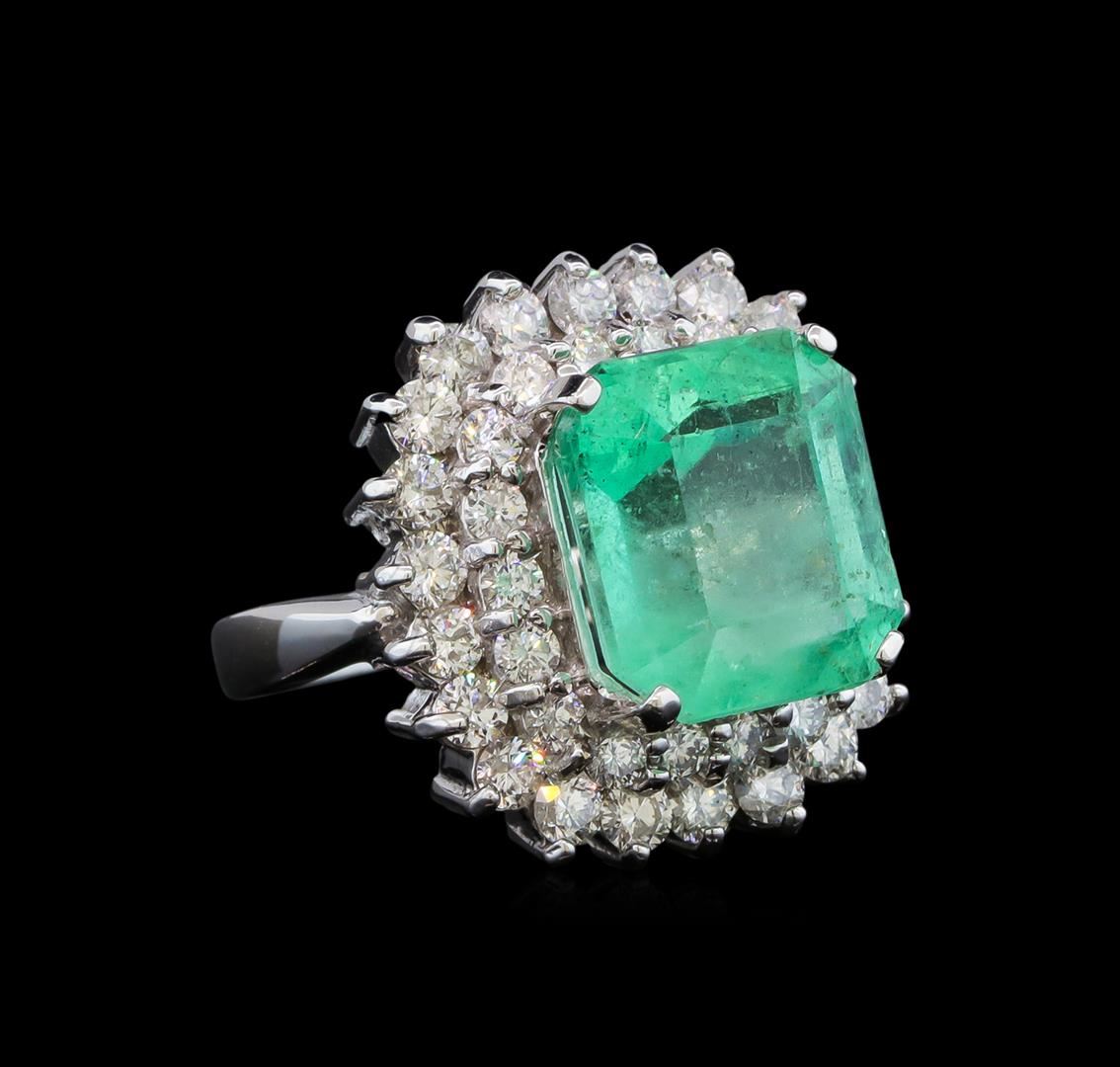 One electronically tested 14KT white gold lady's cast fashion ring with a double cushion halo with a bright polish finish. The featured lady's ring has a shank measuring 2.73 millimeters wide. Identified with markings of 'K14'. Condition is new, good workmanship. Containing: One prong set emerald standard step cut natural emerald, measuring 12.48 x 11.28 x 8.86mm, (depth est.) approximate weight of 8.77ct., clarity is moderately included, medium light, moderately strong, green color, (GIA G 4/4), cut is good. Transmitting light somewhat diffusely, transparent to translucent. Naturally occurring internal & external characteristics are present. Indications of oil residue. Colored gemstones are presumed to have been subjected to commonly used enhancement processes. Graded loose prior to setting in the GIA Laboratory, Report #2175665047. Twenty-Two prong set round brilliant cut diamonds, measuring 2.60 - 2.50 x 1.53mm (depth est.) approximate total weight of 22 Stones = 1.35ct. Graded in the setting. Clarity SI-1 to I-1. Color: G - I Cut Good Eighteen prong set round brilliant cut diamonds, measuring 2.40 - 2.30 x 1.41mm (depth est.) approximate total weight of 18 Stones = 0.85ct. Graded in the setting. Clarity SI-1 to I-1. Color: G - H Cut Good. Total Weight of Colored Stones 8.77ct.. Total Weight of Diamonds 2.20ct.. Total Weight of Ring 12.50gm. GAS Appraised at $17,605.00.