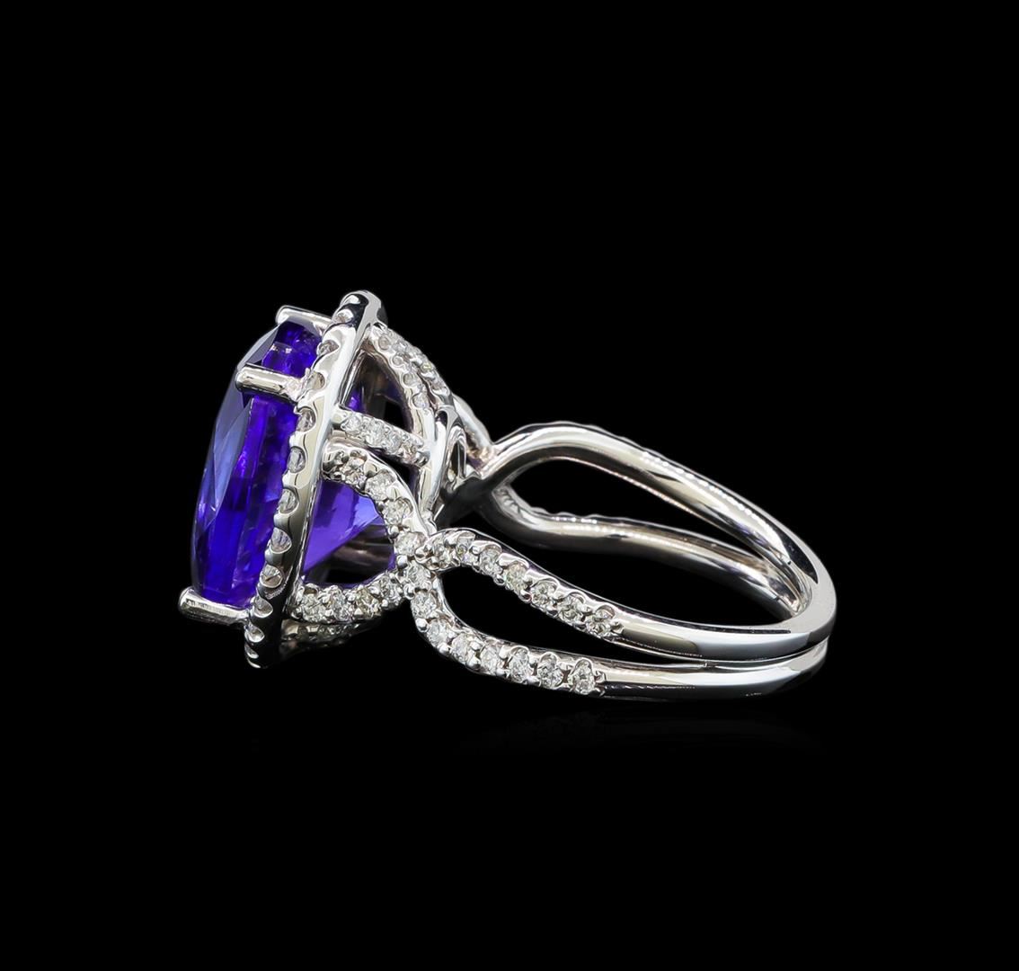 One electronically tested 14KT white gold lady's cast fashion ring with a crossover shank basket halo with a bright polish finish. The featured lady's ring has a double shank measuring 3.16 millimeters wide. Identified with markings of '14K'. Condition is new, good workmanship. Containing: One prong set oval modified brilliant cut natural tanzanite, measuring 13.97 x 11.23 x 7.79mm, (depth est.) 3%. bulge factor, approximate weight of 8.82ct., clarity is eye clean, medium dark, moderately strong, violetish blue color, (GIA vB 6/4), cut is very good. Transmitting light with no distortion, transparent. Colored gemstones are presumed to have been subjected to commonly used enhancement processes. Graded loose prior to setting in the GIA Laboratory, Report #2175665889. Seventy-Four prong set round brilliant cut diamonds, measuring 1.35 - 1.25 x 0.81mm (depth est.) approximate total weight of 74 Stones = 0.63ct. Graded in the setting. Clarity SI-1 to I-1. Color: G - I Cut Good Thirty-Two prong set round brilliant cut diamonds, measuring 1.10 - 1.00 x 0.65mm (depth est.) approximate total weight of 32 Stones = 0.15ct. Graded in the setting. Clarity SI-1 to I-1. Color: H - I Cut Good. Total Weight of Colored Stones 8.82ct.. Total Weight of Diamonds 0.78ct.. Total Weight of Ring 8.30gm. GAS Appraised at $18,880.00.