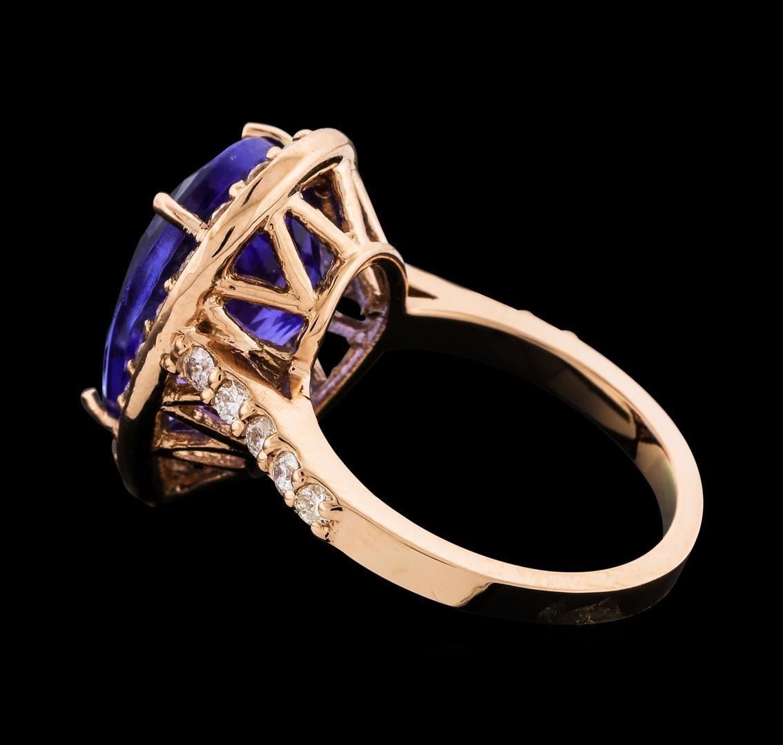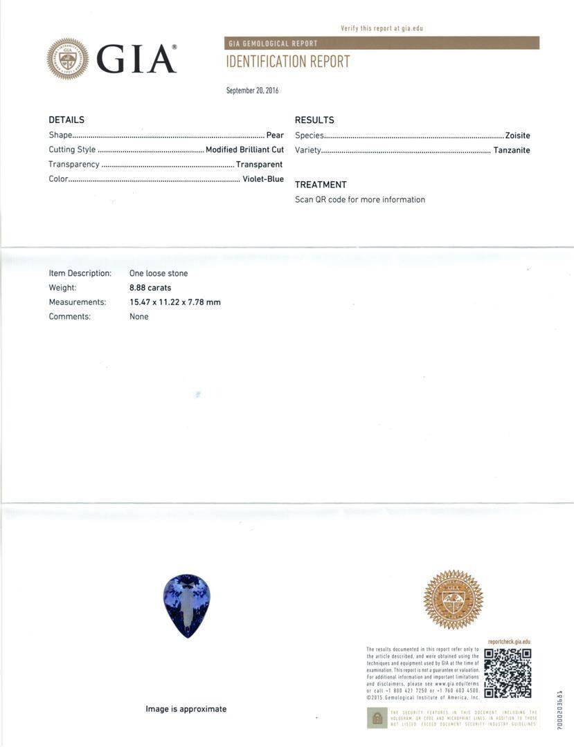 One electronically tested 14KT rose gold lady's cast fashion ring with a basket halo with a bright polish finish. The featured lady's ring has a shank measuring 2.08 millimeters wide. Identified with markings of '14K'. Condition is new, good workmanship. Containing: One prong set pear modified brilliant cut natural tanzanite, measuring 15.47 x 11.22 x 7.78mm, (depth est.) approximate weight of 8.88ct., clarity is eye clean, medium, strong, violetish blue color, (GIA vB 5/5), cut is very good. Transmitting light with no distortion, transparent. Colored gemstones are presumed to have been subjected to commonly used enhancement processes. Graded loose prior to setting in the GIA Laboratory, Report #2175847811. Thirty prong set round brilliant cut diamonds, measuring 2.00 - 1.90 x 1.17mm (depth est.) approximate total weight of 30 Stones = 0.82ct. Graded in the setting. Clarity SI-1 to SI-2. Color: H - I Cut Good. Total Weight of Colored Stones 8.88ct.. Total Weight of Diamonds 0.82ct.. Total Weight of Ring 7.30gm. GAS Appraised.